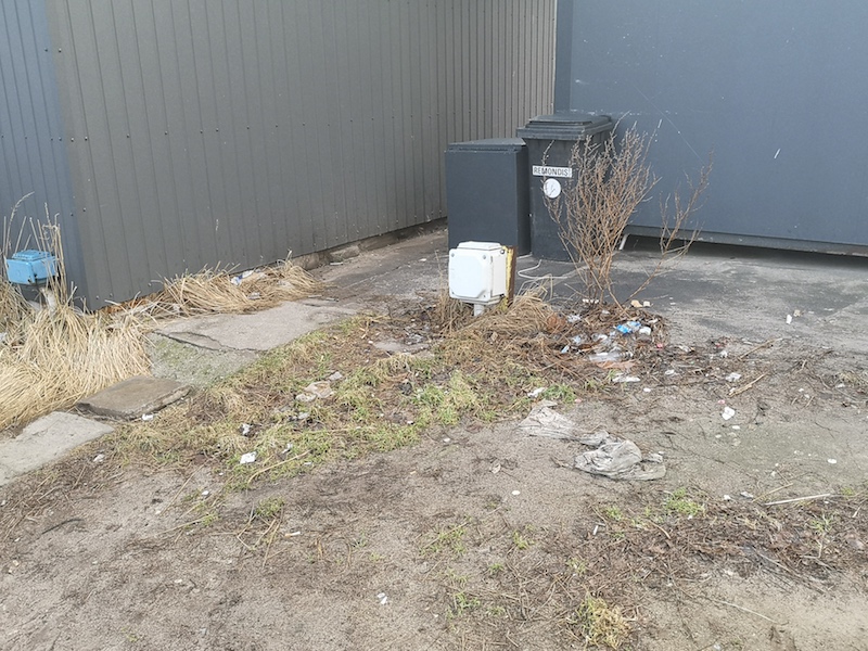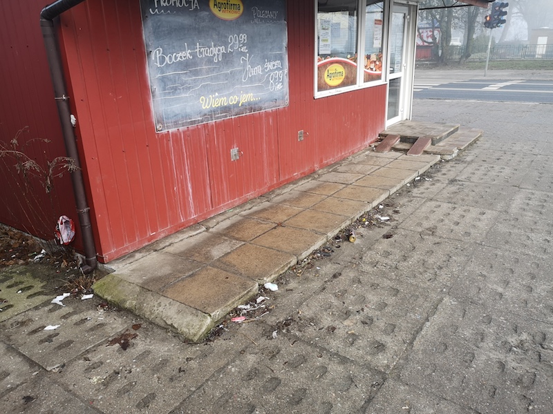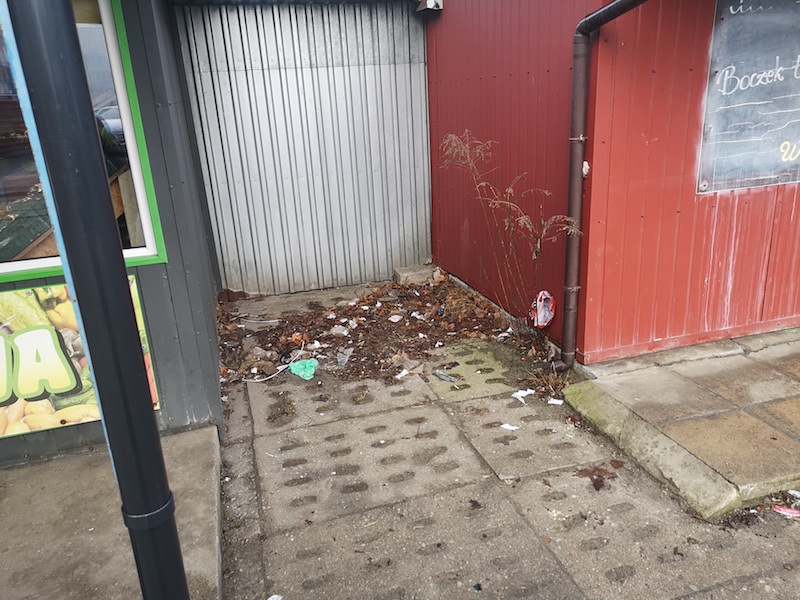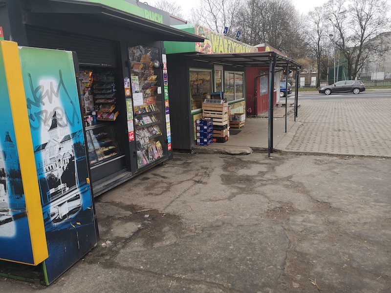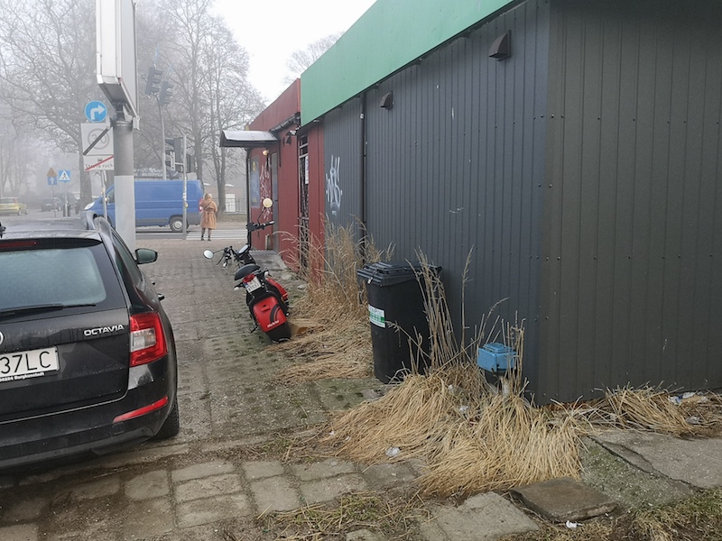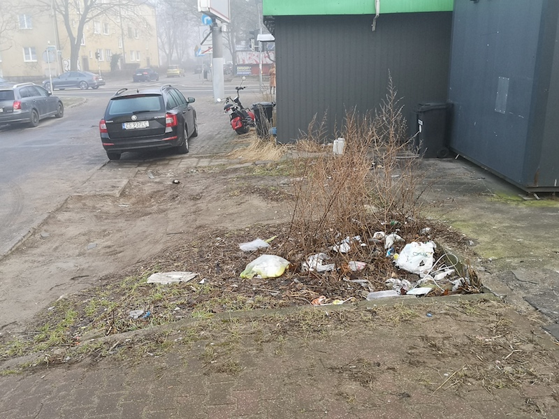 Na osiedlu Kaliny w Szczecinie, koło remontowanego sklepu „Syriusz”, stoją trzy kioski handlowe. Wokół nich, a szczególnie z tyłu, leżą stosy śmieci, rośną chwasty i stoi porzucony skuter elektryczny.