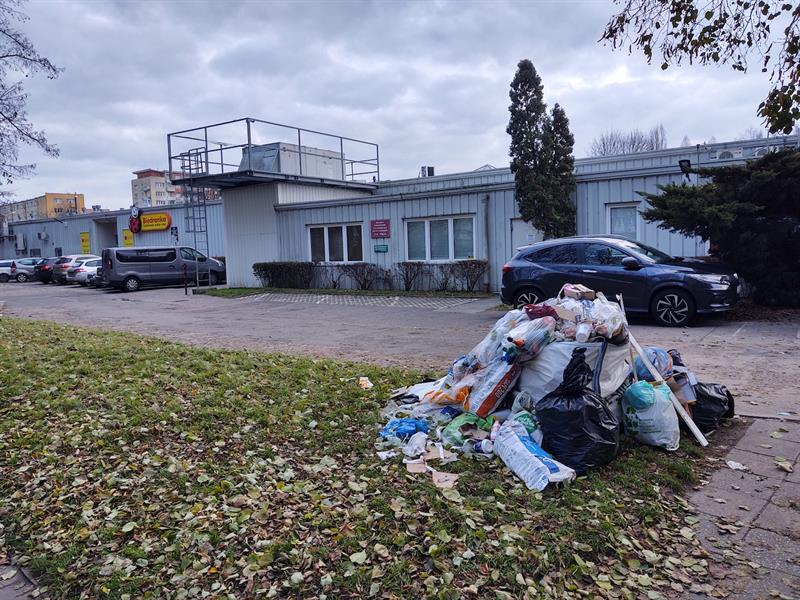 Chaos wywołany znakami drogowymi, rozjeżdżanie trawników przez parkujące na nich samochody, w tym dostawcze, oraz sterta śmieci, m.in. bytowych – to problemy, na które zwraca uwagę nasz Czytelnik. Dotyczą one placu Witosa, czyli działki nr 13/19 według Geoportalu360.pl, na której stoi Centrum Handlowe Fala.