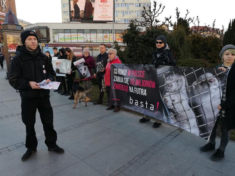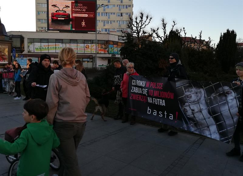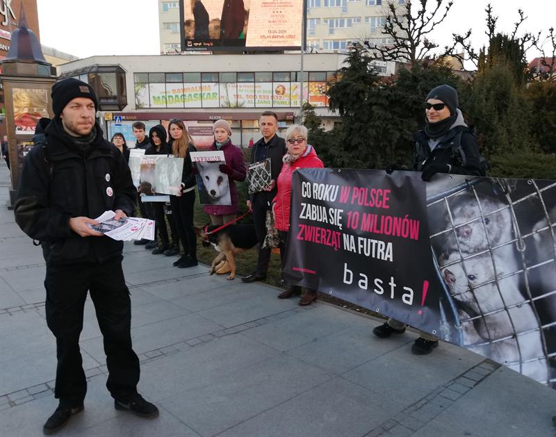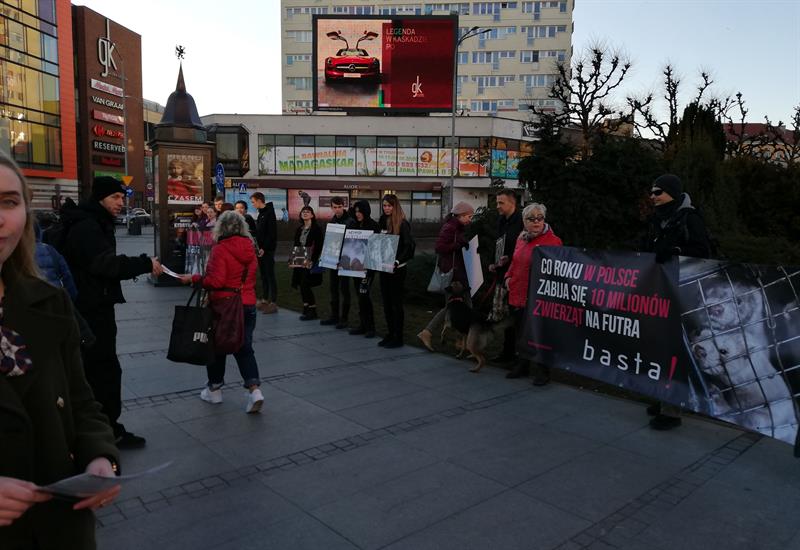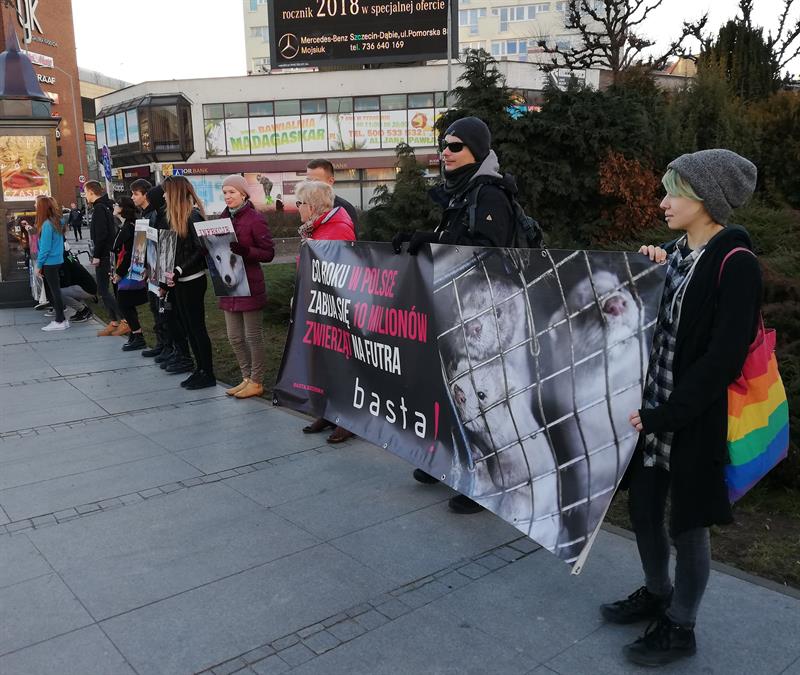 „Przez ten punkt na mapie Szczecina codziennie przechodzi mnóstwo ludzi. Wielu z nich nie ma pojęciach o realiach funkcjonowania futrzarskich, o dziejącym się w nich okrucieństwie, a też o cierpieniu milionów zwierząt zabijanych dla futer. Jesteśmy tu dla nich. Żeby zobaczyli, z czym wiąże się ten przemysł" - mówiła Dominika Tomczak, uczestnicząca w akcji ulicznej, ph. „Szczecin bez futra", zorganizowanej w środę (27 lutego) na pl. Żołnierza Polskiego przez BASTA! Inicjatywę na Rzecz Zwierząt. Aktywiści apelowali o wprowadzenie w Polsce całkowitego zakazu hodowania oraz zabijania zwierząt na futra.