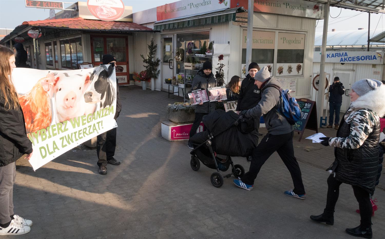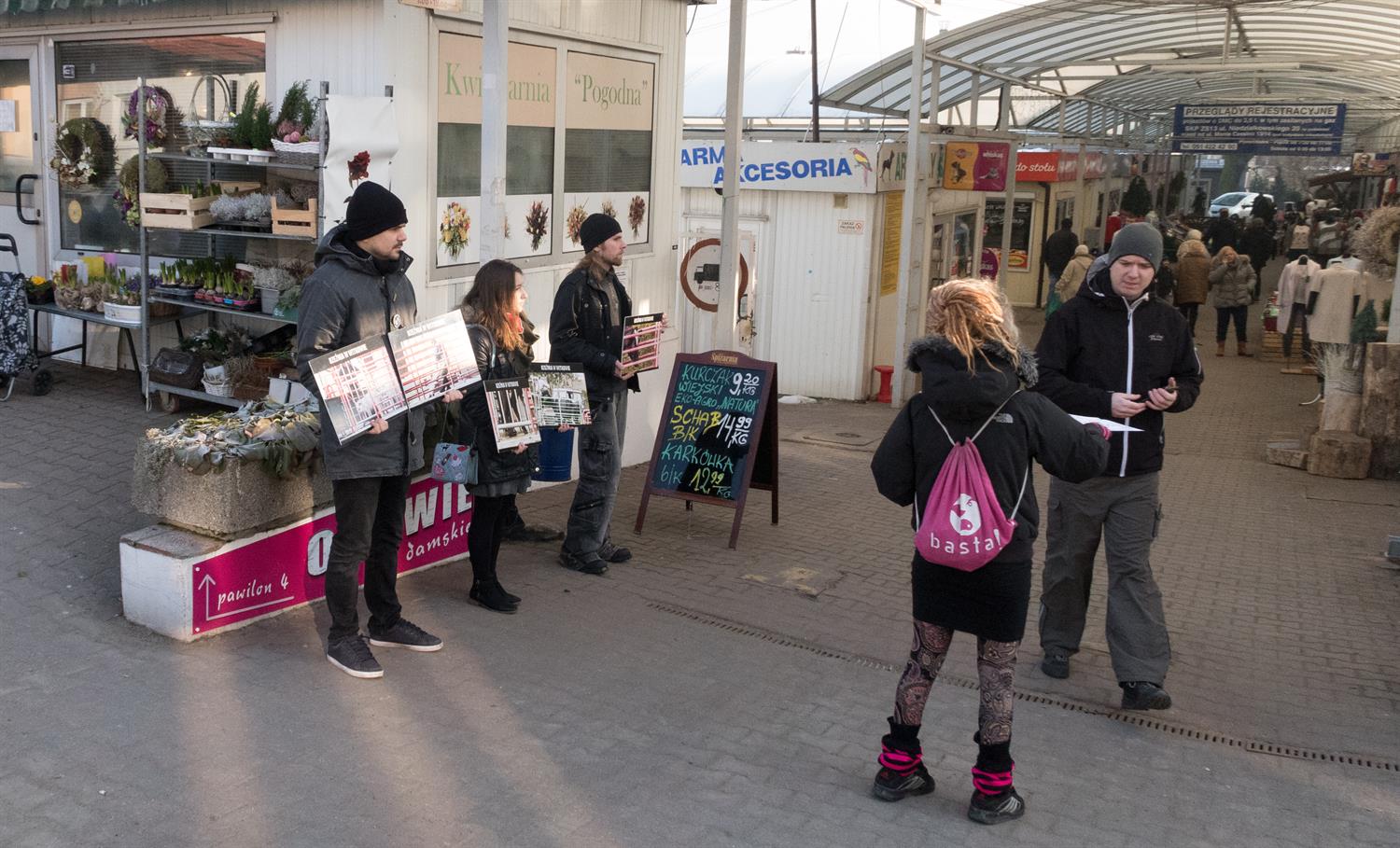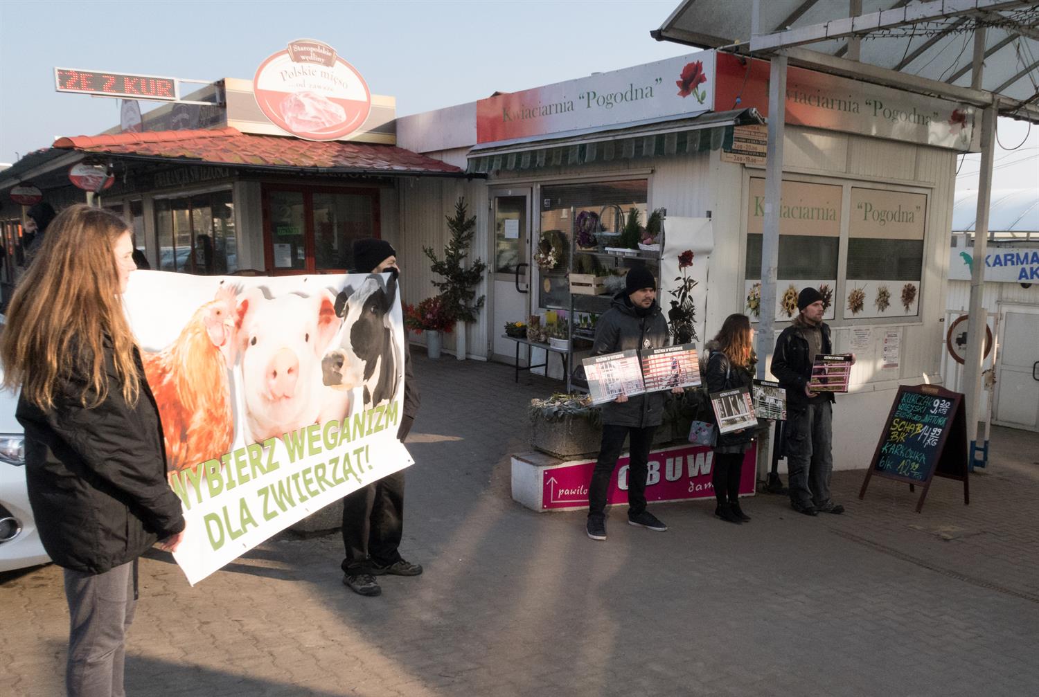 Stają z transparentami, na których widać kadry okrutnych realiów rzeźni, aby przypomnieć przechodniom, że „bracia mniejsi" czują jak my: ból, strach, chłód i głód, mają prawo do godności i życia zgodnie ze swą naturą. Zachęcają również przechodniów: „Powiedz stanowcze NIE przemocy i przejdź na weganizm, czyli na styl życia polegający na minimalizacji cierpienia zwierząt". Co znaczy zmień dietę na roślinną, zrezygnuj z futer, odzieży skórzanej, kosmetyków zawierających składniki pochodzenia zwierzęcego i testowanych na zwierzętach, bojkotuj wszystkie formy ich wykorzystywania, czyli także cyrki ze zwierzętami.