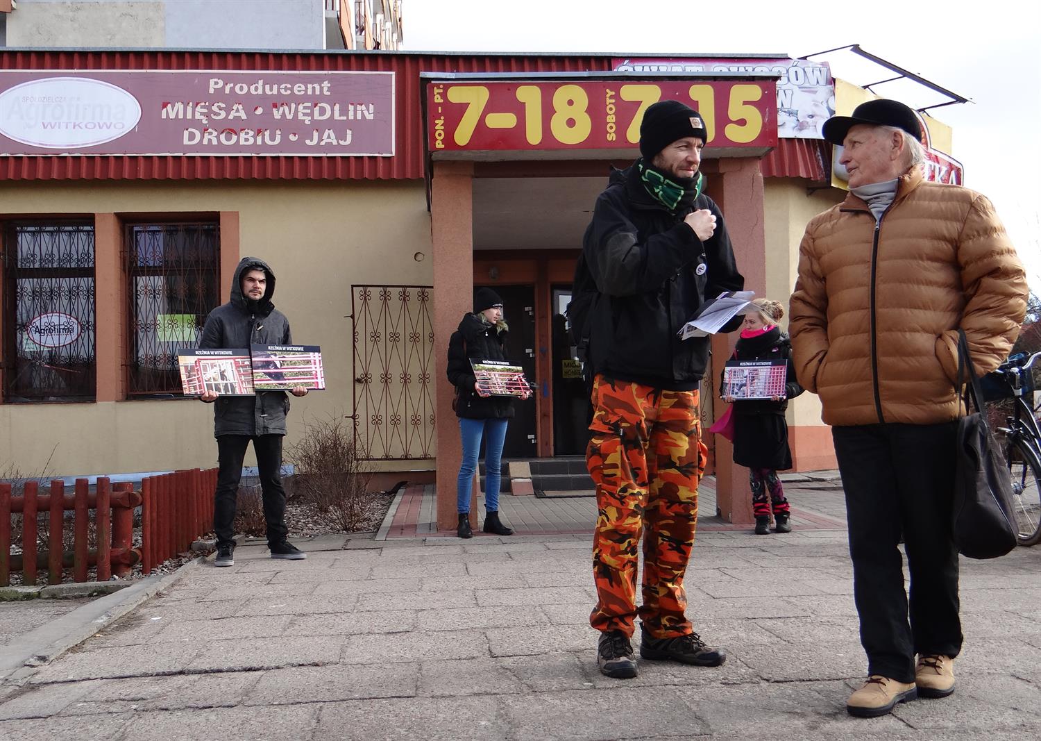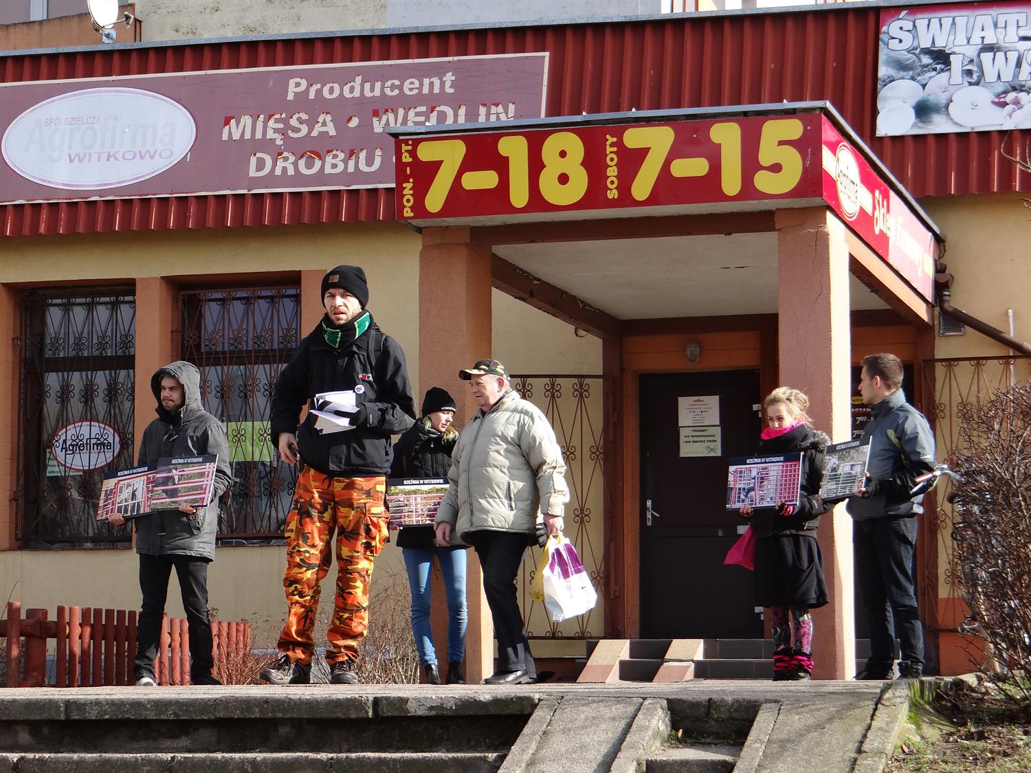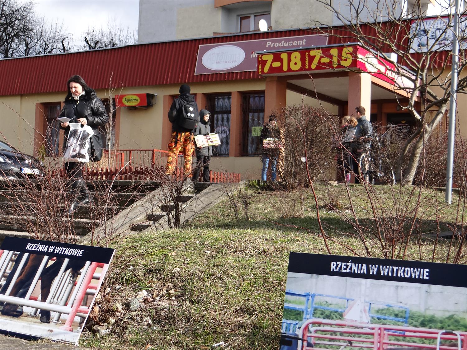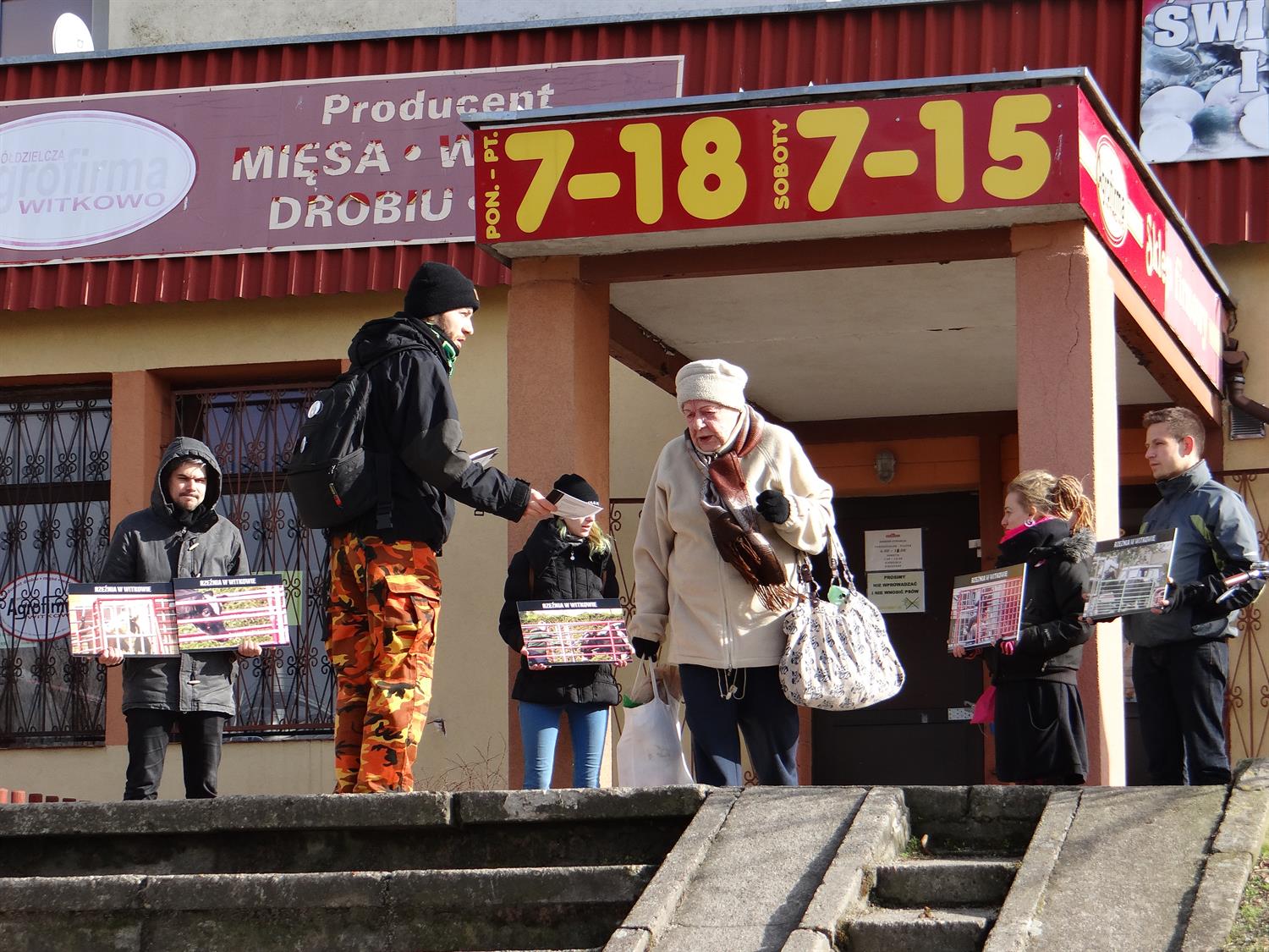 Zaopatrzeni w fotogramy rozdawali przechodniom i klientom ulotki.To co aktywiści BASTY prezentowali i próbowali uświadomić osobom, które wchodziły do sklepu i z niego wychodziły, wyraźnie kontrastowało z treścią tablic reklamowy przed sklepem, które na co dzień zachwalają wyroby Agrofirmy Witkowo, w tym takimi sloganami, jak: "Od pola do stołu" czy "Wędliny godne każdego stołu!".