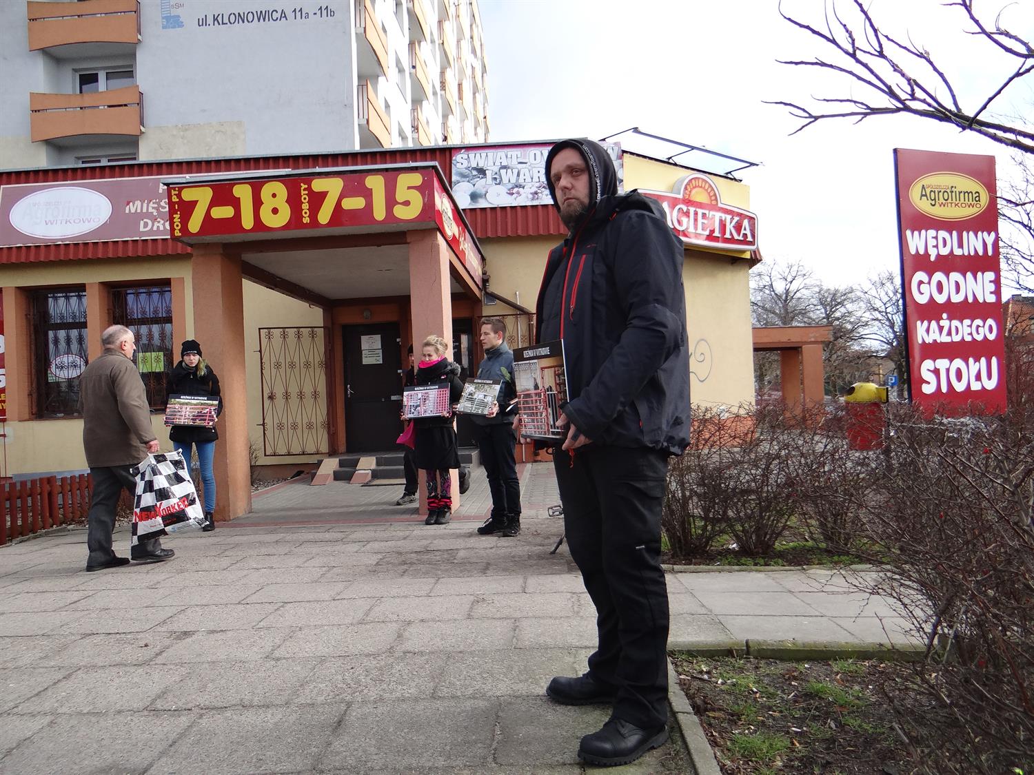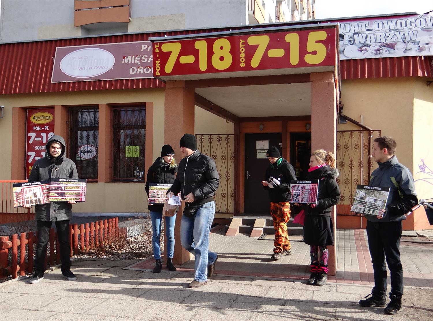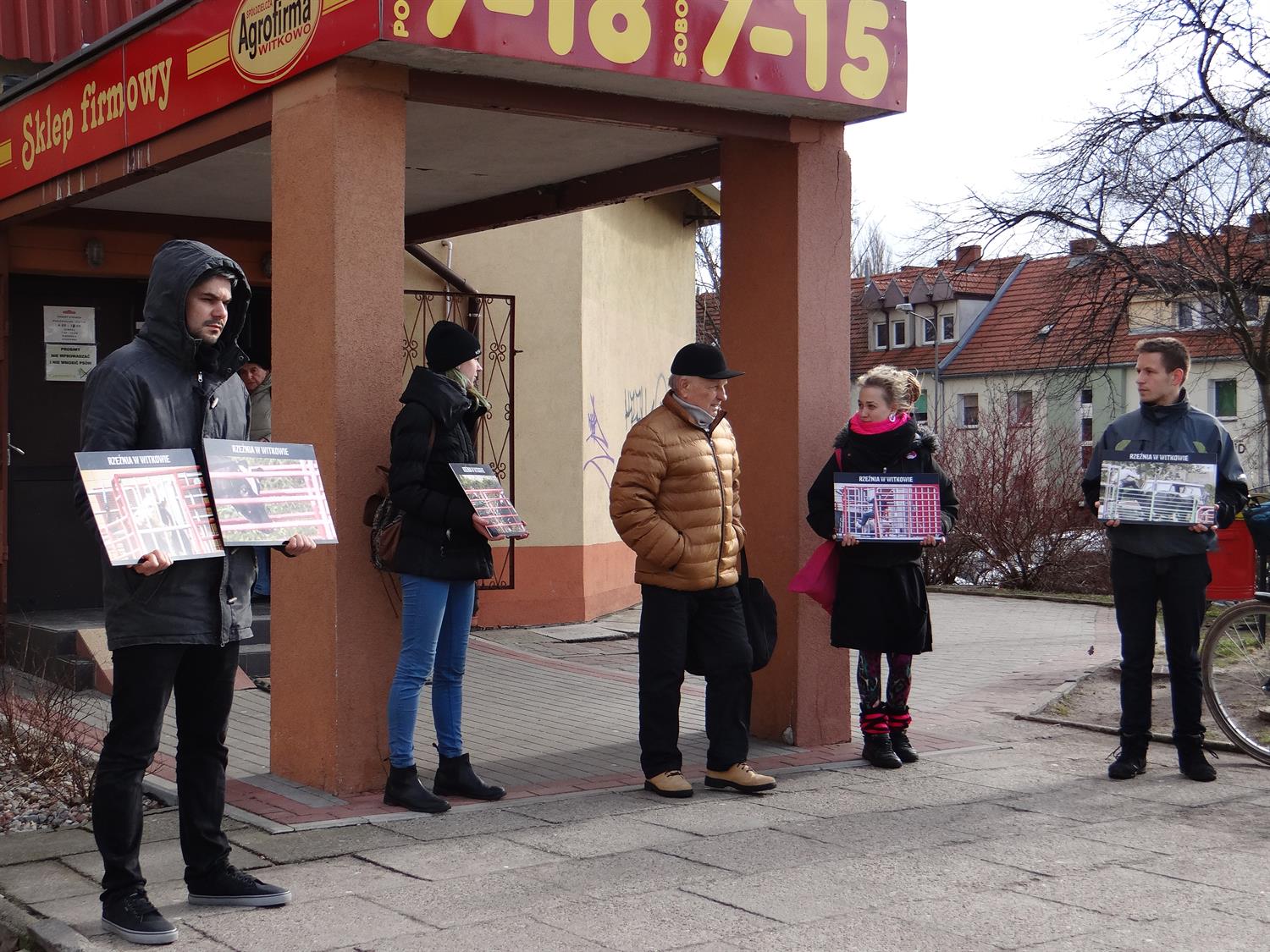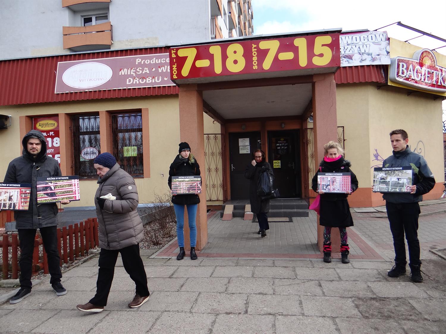 Zaopatrzeni w fotogramy rozdawali przechodniom i klientom ulotki.To co aktywiści BASTY prezentowali i próbowali uświadomić osobom, które wchodziły do sklepu i z niego wychodziły, wyraźnie kontrastowało z treścią tablic reklamowy przed sklepem, które na co dzień zachwalają wyroby Agrofirmy Witkowo, w tym takimi sloganami, jak: "Od pola do stołu" czy "Wędliny godne każdego stołu!".