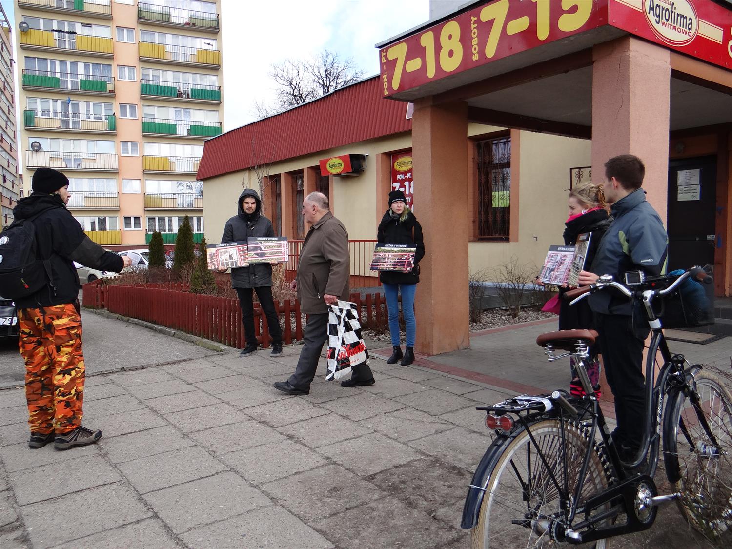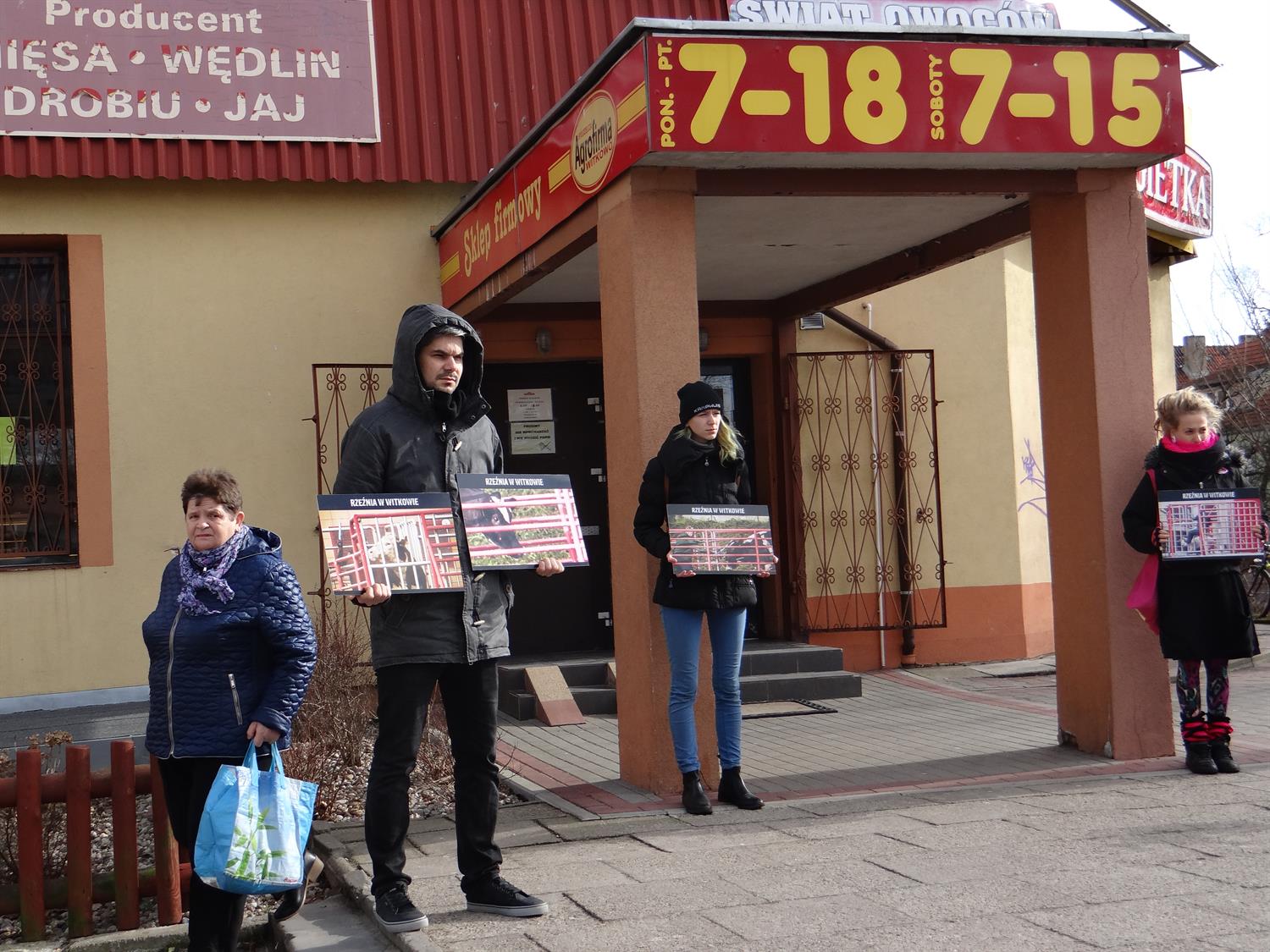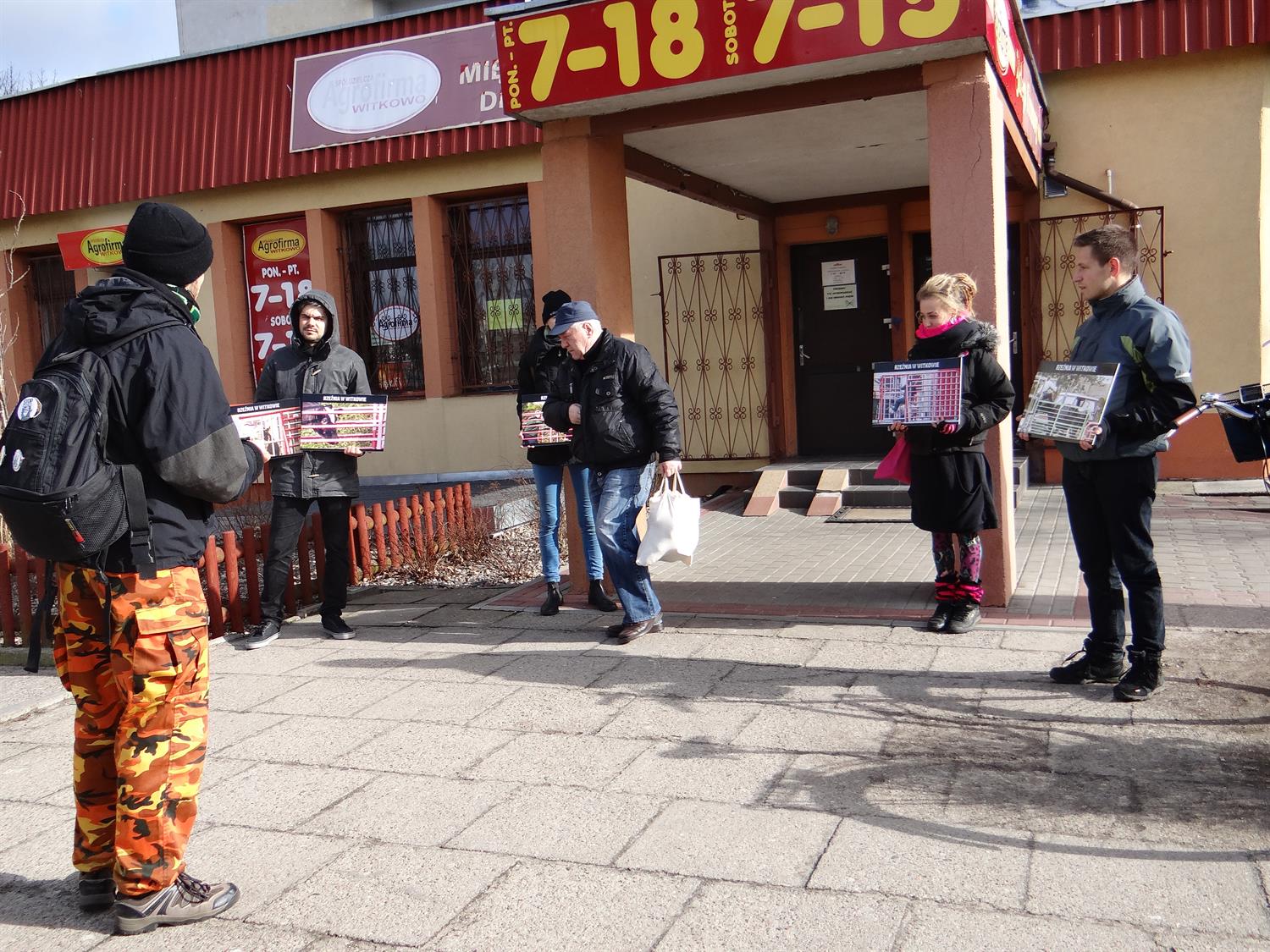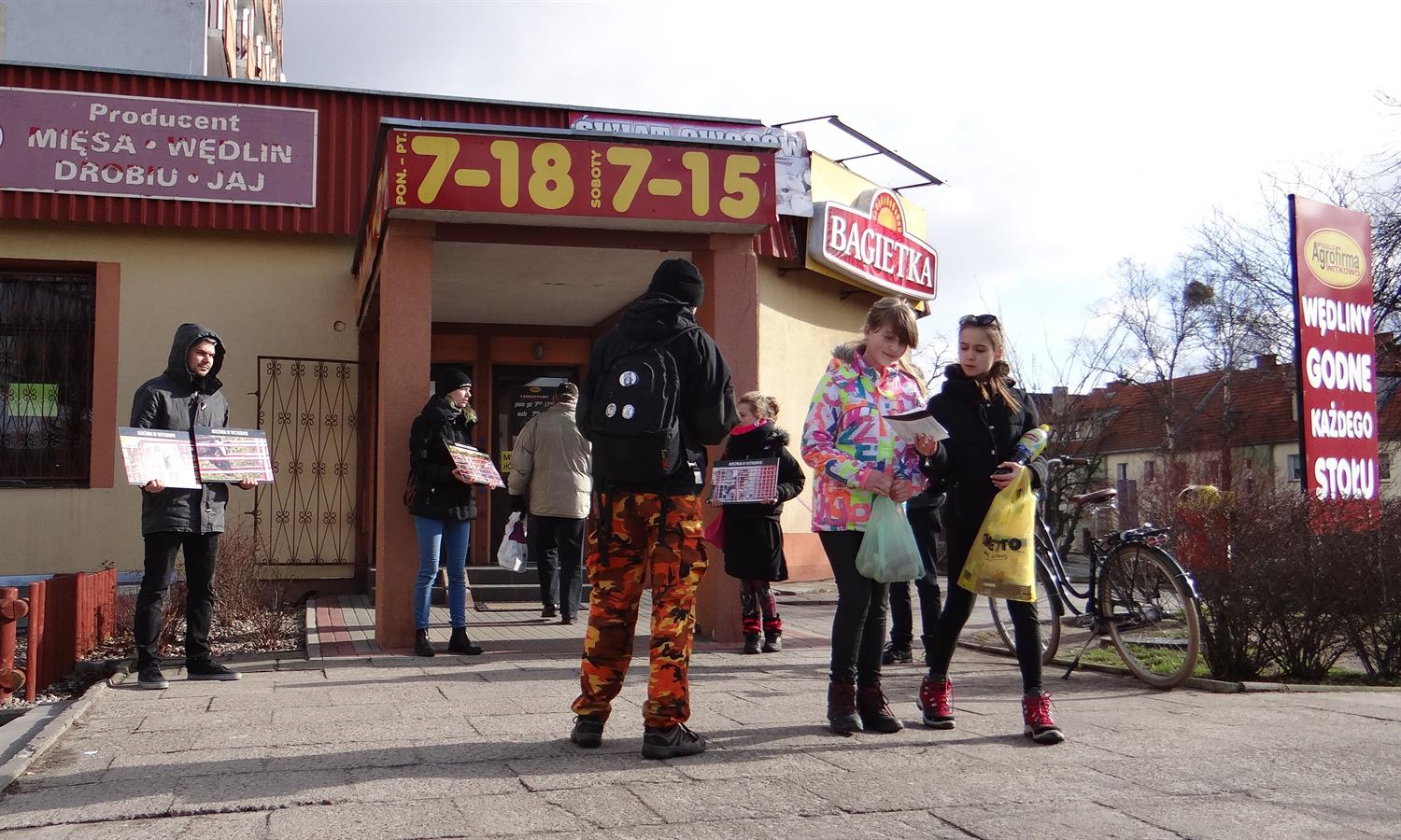 Zaopatrzeni w fotogramy rozdawali przechodniom i klientom ulotki.To co aktywiści BASTY prezentowali i próbowali uświadomić osobom, które wchodziły do sklepu i z niego wychodziły, wyraźnie kontrastowało z treścią tablic reklamowy przed sklepem, które na co dzień zachwalają wyroby Agrofirmy Witkowo, w tym takimi sloganami, jak: "Od pola do stołu" czy "Wędliny godne każdego stołu!".