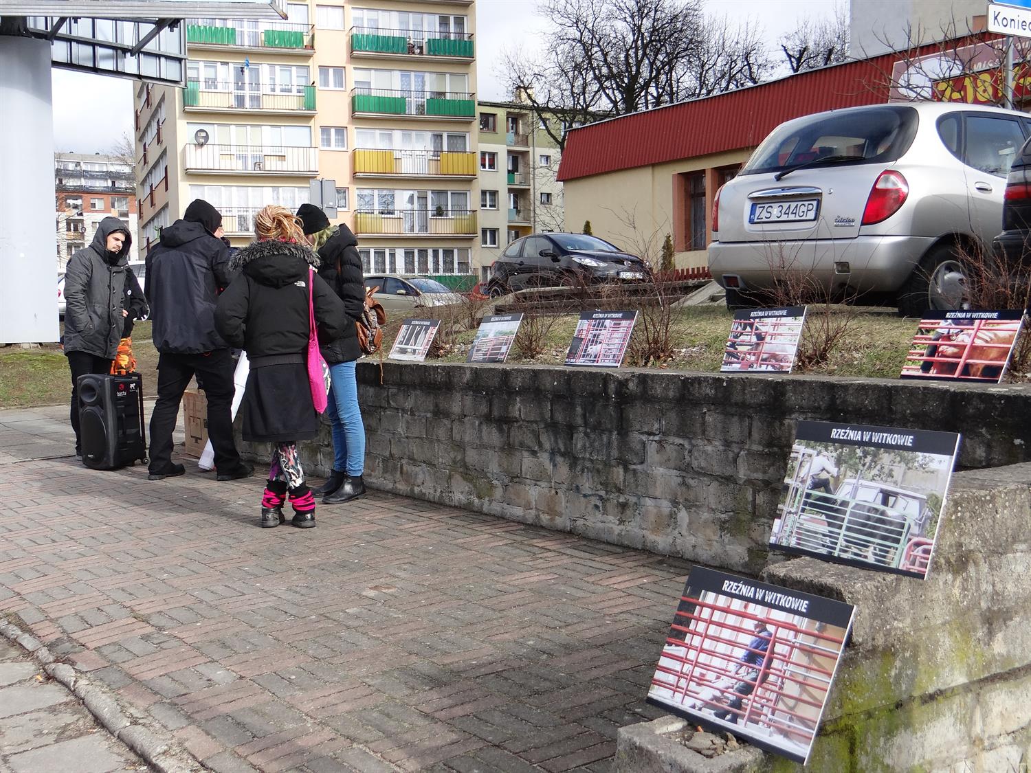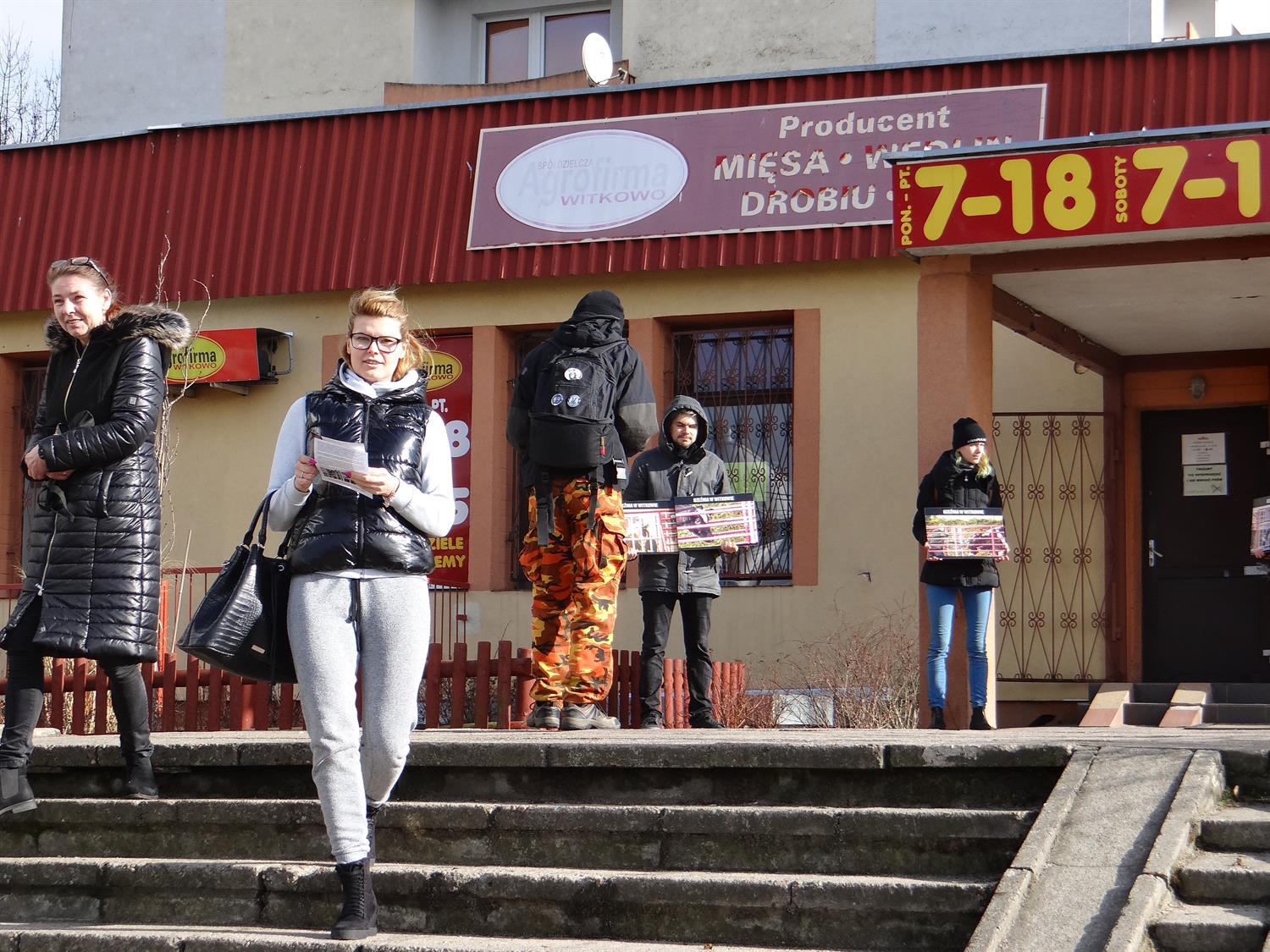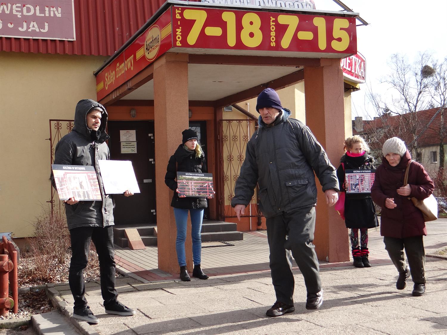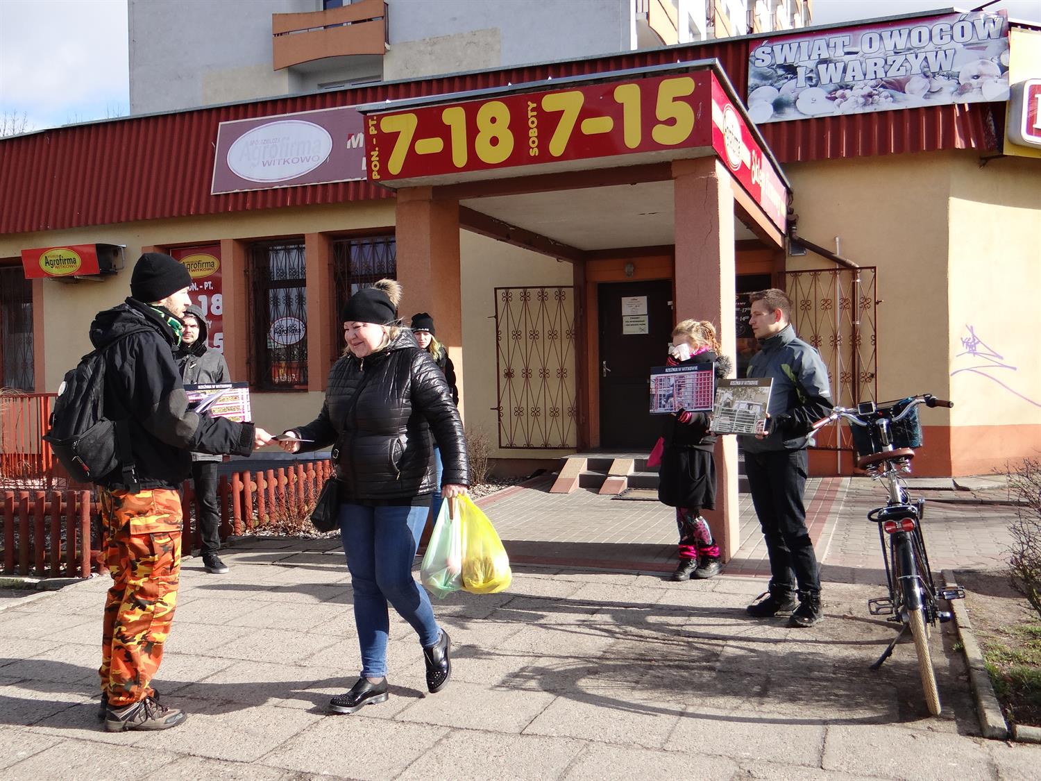 Zaopatrzeni w fotogramy rozdawali przechodniom i klientom ulotki.To co aktywiści BASTY prezentowali i próbowali uświadomić osobom, które wchodziły do sklepu i z niego wychodziły, wyraźnie kontrastowało z treścią tablic reklamowy przed sklepem, które na co dzień zachwalają wyroby Agrofirmy Witkowo, w tym takimi sloganami, jak: "Od pola do stołu" czy "Wędliny godne każdego stołu!".