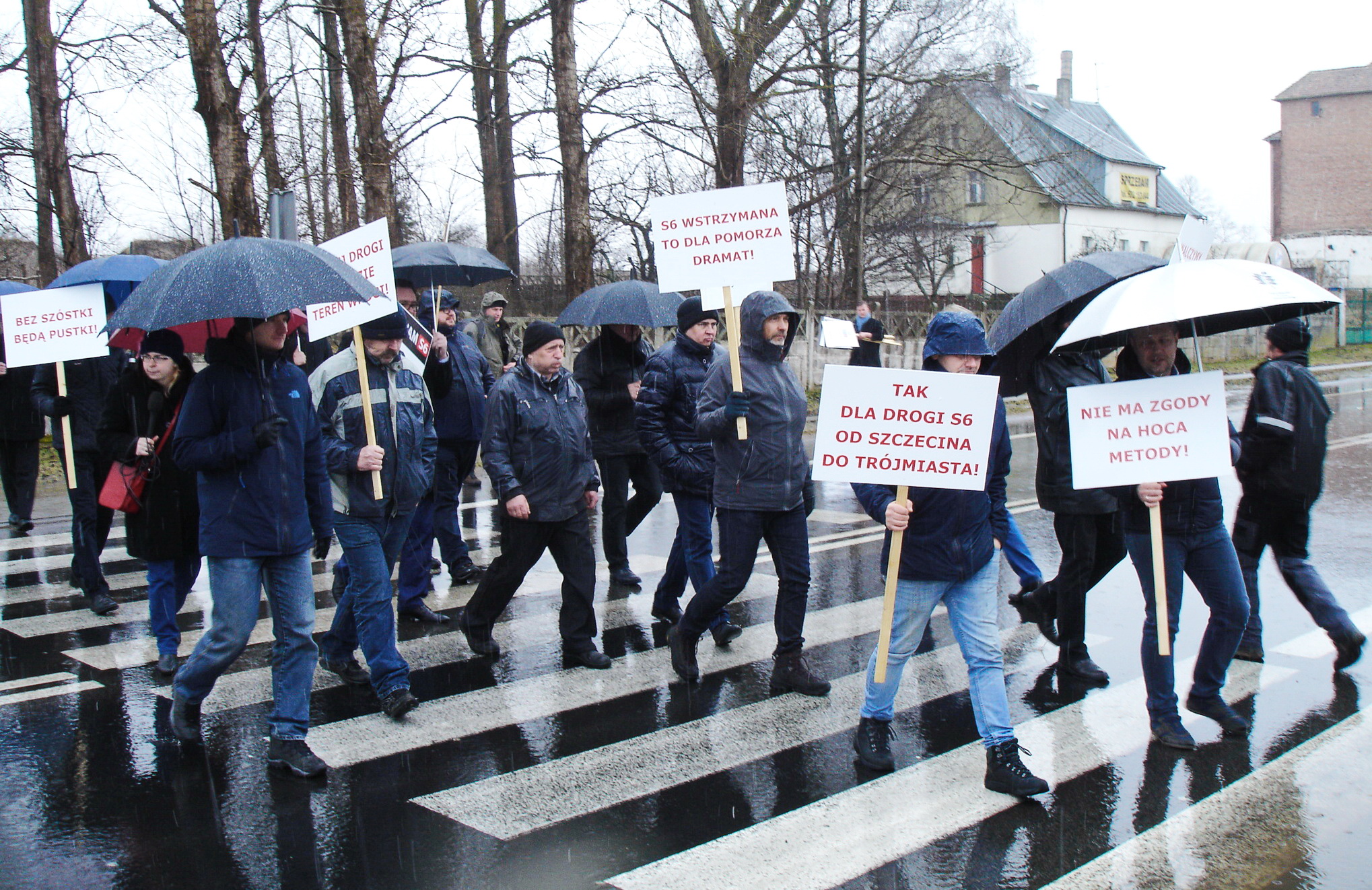 Na zdjęciu: „S6 wstrzymana to dla Pomorza dramat”, „Bez szóstki będą pustki”, czy „Bez tej drogi będzie teren wrogi” – takiej treści transparenty m.in. nosili uczestnicy marcowej pikiety w Sławnie.