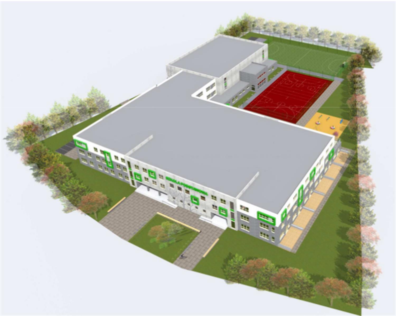 Budynek nowej szkoły będzie miał trzy piętra. Znajdą się w nim 44 sale lekcyjne, świetlica, aula, stołówka, biblioteka z czytelnią, szatnie z zamykanymi szafkami dla każdego ucznia. Szkoła posiadać będzie kompleks sportowy, w skład którego wejdą: hala sportowa 22 m na 44 m o wysokości 11 m, sala do gimnastyki korekcyjnej lub innych zajęć ruchowych (wysokości min. 7 m), zaplecze szatniowo-sanitarne, magazyn sprzętu i zapleczem dla nauczycieli. Widownia hali pomieści 200 osób.