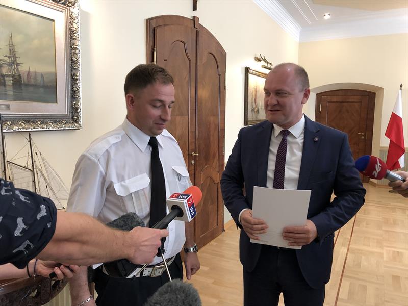- Ratował pan osobę, która była w potrzebie. Bardzo serdecznie dziękuję za zaangażowanie, właściwą postawę i dawanie dobrego przykładu - mówił Piotr Krzystek. - Mężczyzna zasłabł, pojawił się stan zagrożenia życia. Nie wszyscy tak reagują. Pojawiło się tam bardzo wiele osób, niektórzy przechodzili, inni się przyglądali. Dobrze, że był tam pan Grzegorz. Wykorzystał swoje umiejętności i dzięki temu wszystko zakończyło się szczęśliwie.
