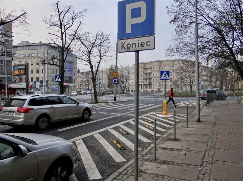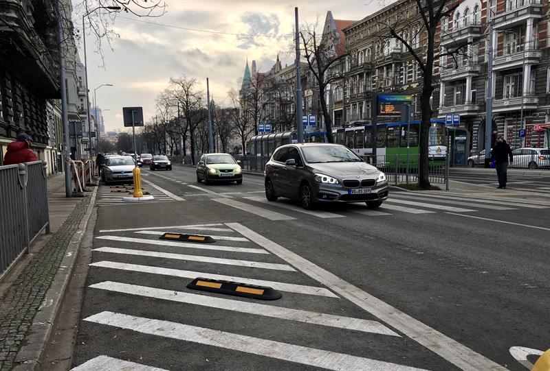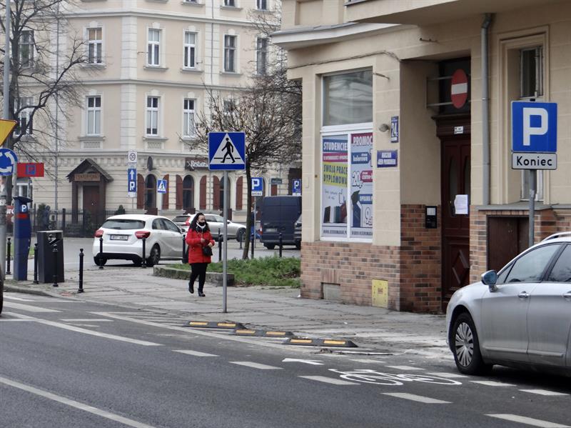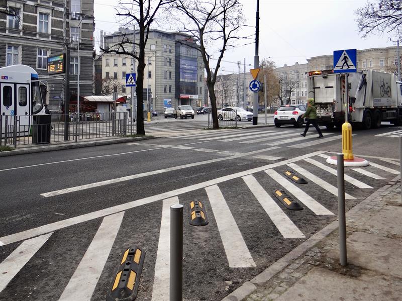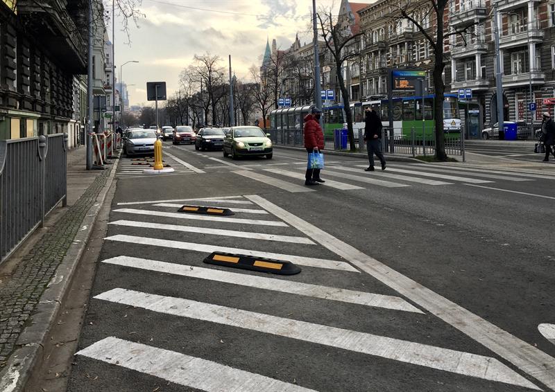 W rejonie przejść dla pieszych powstały martwe pola z dodatkowo wmontowanymi w nie poprzecznie ogranicznikami skrajni ze światłami odblaskowymi. Te wraz ze słupkami w chodniku mają studzić zapędy do parkowania tuż przy przejściach.