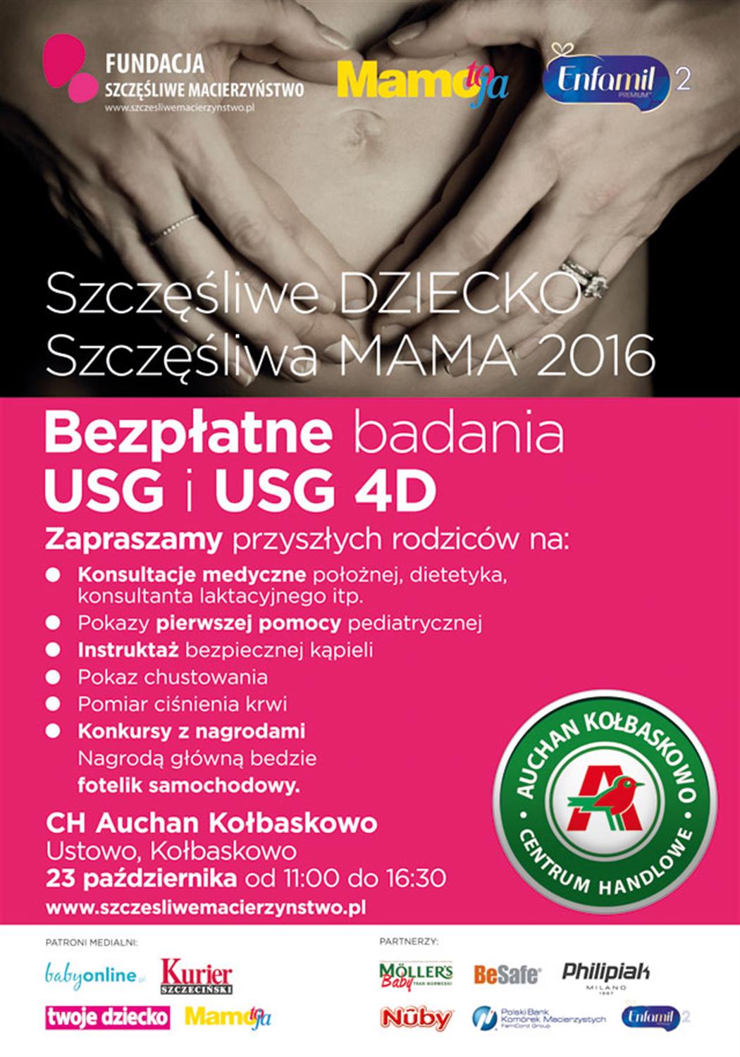 Fundacja Szczęśliwe Macierzyństwo i CH Auchan Kołbaskowo zapraszają na darmowe badania i konsultacje medyczne. W niedzielę, 23 bm. podczas akcji „Szczęśliwe Dziecko, Szczęśliwa Mama 2016” w Auchan Kołbaskowo można wykonać bezpłatne USG i USG 4D, będą też konsultacje medyczne, praktyczne porady i konkursy.