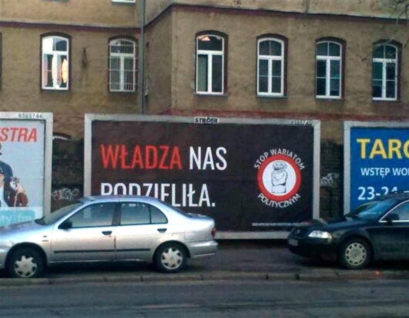 „Władza nas podzieliła" - to napis na czarnym billboardzie, sygnowanym jako Obywatelska Inicjatywa Ustawodawcza STOP Wariatom Politycznym. Pojawił się u zbiegu al. Powstańców Wielkopolskich i ul. Milczańskiej - pierwszy w Szczecinie, a zapowiadający kampanię dla uzyskania poparcia pod ogólnopolską petycją o nowelizację ordynacji wyborczej rad gmin, rad powiatów i sejmików województw, a też do Sejmu i Senatu RP.