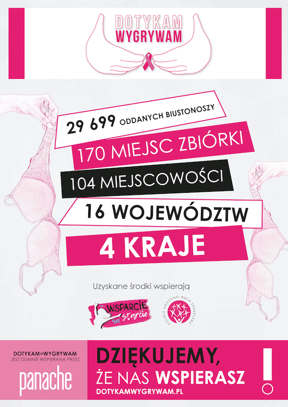 – Nie mam słów, by opisać radość jaką odczuwam na myśl tegorocznej kampanii DOTYKAM=WYGRYWAM. Spontaniczne inicjatywy, które kiełkowały jak grzyby po deszczu w różnych miejscach Polski, zbieranie starych biustonoszy, nasz reCYCling w szpitalach, sklepach spożywczych, szkołach, bankach, gabinetach ginekologicznych, korporacjach i kancelariach adwokackich zaowocowały tak ogromnym zaangażowaniem i rekordowym wynikiem zebranych biustonoszy. 29 699 ta liczba przerosła moje najśmielsze oczekiwania! – mówi Izabela Sakutova, inicjatorka kampanii DOTYKAM=WYGRYWAM.