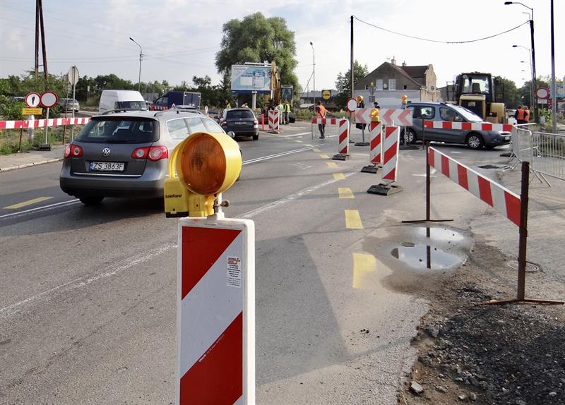 Prace przy przebudowie węzła drogowego w Podjuchach i uszczelniona blokada przejazdu przez zamknięty dla ruchu samochodów odcinek ul. Granitowej przy skrzyżowaniu z ul. Floriana Krygiera.