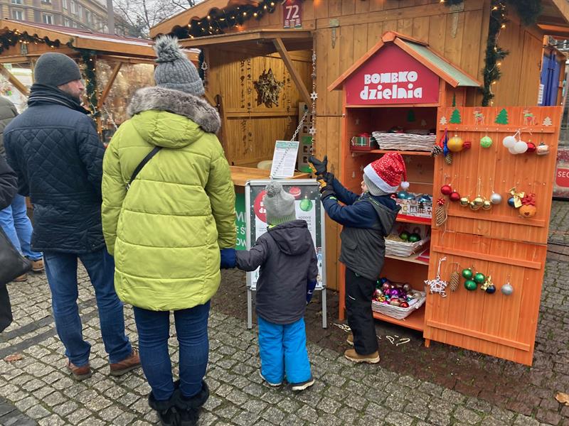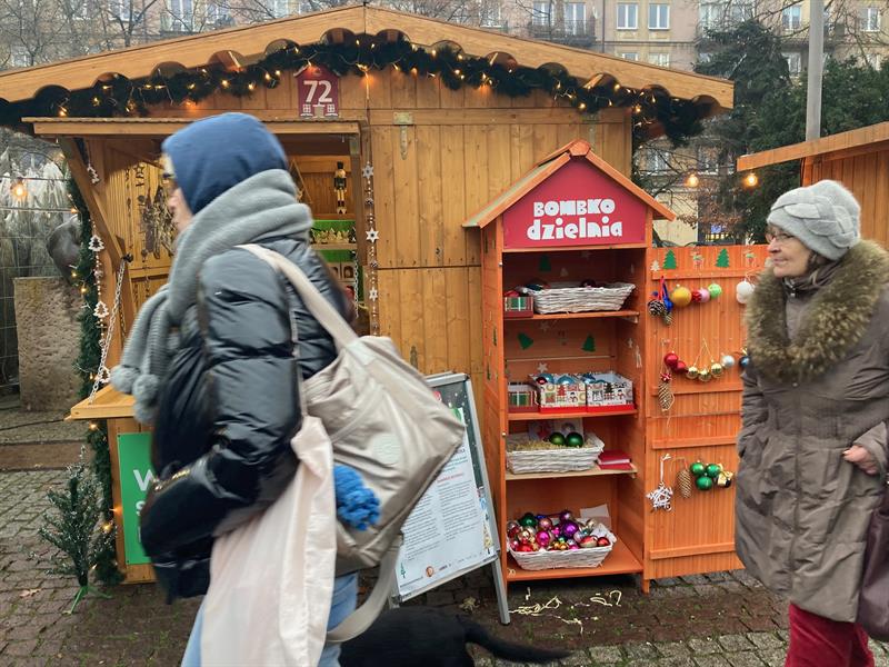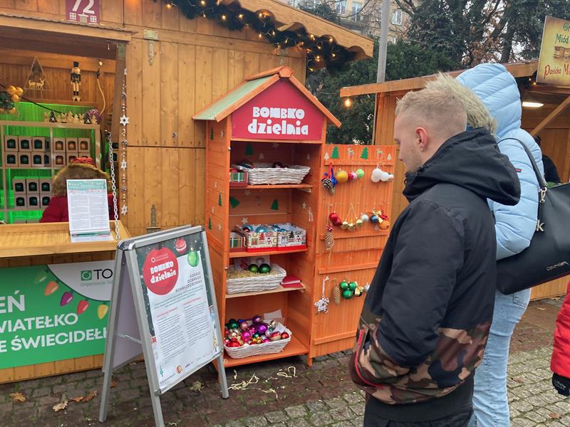„Dzielmy się! Bądźcie EKOświąteczni" - zachęcają organizatorzy Jarmarku Bożonarodzeniowego w Szczecinie. Temu właśnie służy bombkodzielnia, jak nieformalnie został nazwany punkt wymiany ozdób świątecznych działający pośród kiermaszowych stoisk pl. Lotników.