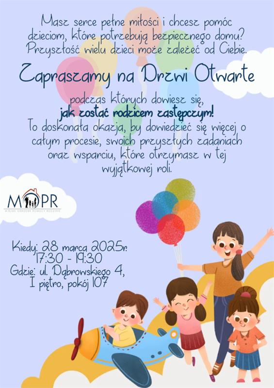 Aby rozwiać wątpliwości i odpowiedzieć na wszystkie pytania, Miejski Ośrodek Pomocy Rodzinie (MOPR) organizuje kwartalne dni otwarte dla osób zainteresowanych rodzicielstwem zastępczym. To doskonała okazja, by dowiedzieć się, jak wygląda ten proces, jakie są wymagania oraz jakie wsparcie otrzymują rodzice zastępczy.
