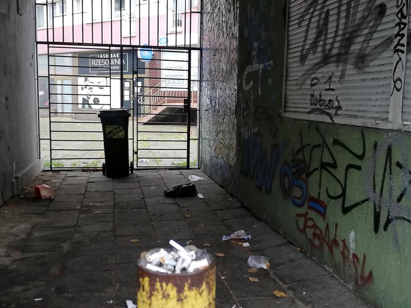 Kosz stoi daleko od wejścia, tuż przy kracie. Na końcu "tunelu" otwartej i nieoświetlonej bramy: odpychającej obscenicznymi bazgrołami na ścianach, cuchnącej uryną i zarzuconej wszelakimi odpadami. To punkt na mapie - przynajmniej z założenia - prestiżowego szczecińskiego "Złotego szlaku", czyli al. Papieża Jana Pawła II. Pomiędzy filią miejskiej biblioteki publicznej a „Żabką". To brama ze świetną lokalizacją i widokiem na jedną z najnowszych miejskich rewitalizacji - pl. Adamowicza. Niestety, to również fragment pejzażu niezmiennie brudnego centrum, w którym nader łatwo łatwo zapomnieć o wielkich ambicjach metropolitarnych Szczecina.