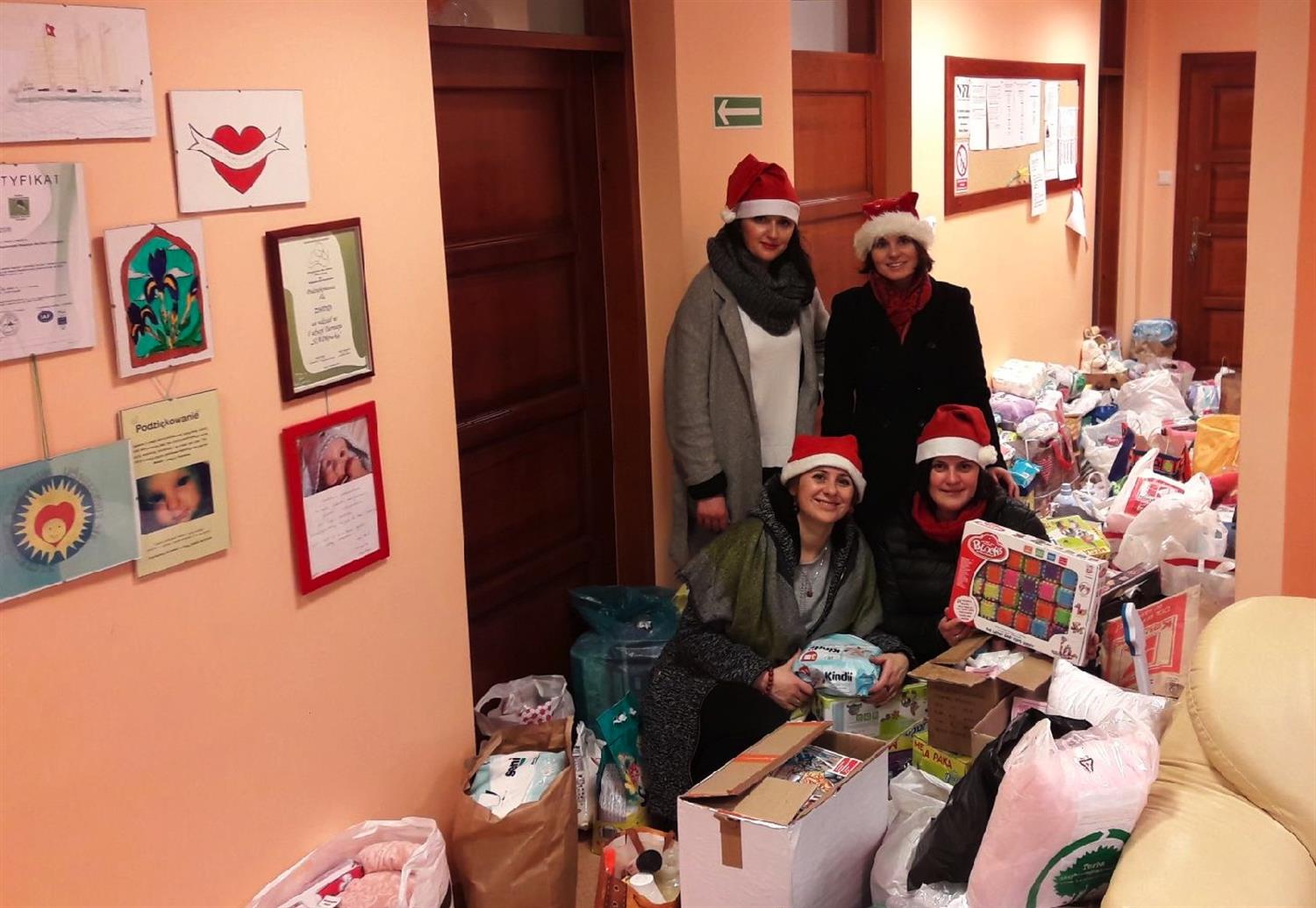 2. Na zdjęciu z przekazania darów dla hospicjum (od lewej - góra): Justyna Postek (kucharka), Agnieszka Łaskarzewska (dyrektor żłobka) oraz (na dole)Edyta Dziarmaga (opiekunka), Katarzyna Gawron (intendentka).