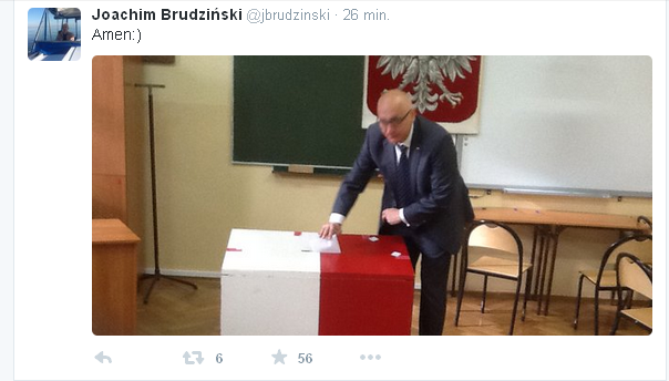 Joachim Brudziński wrócił do lokalu wyborczego. Tym razem miał już ze sobą dowód osobisty. Dostał karty do głosowania i spełnił obowiązek obywatelski, o czym poinformował na Twitterze.©℗