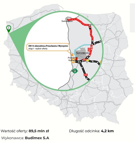 - Wybraliśmy najkorzystniejszą ofertę w przetargu na realizację pierwszego etapu obwodnicy Przecławia i Warzymic w ciągu DK13 - w piątek (22 stycznia) poinformowała GDDKiA w Szczecinie. W przetargu zwyciężyła firma Budimex SA, która zaoferowała za wykonanie obwodnicy kwotę 89,5 mln złotych.
