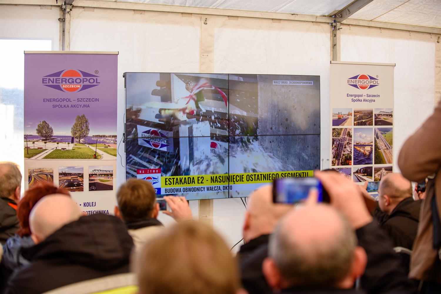 Na zdjęciu: Nasunięcie ostatniego segmentu tak zwanego ustroju nośnego estakady E2 w ciągu drogi ekspresowej S10 będącej obwodnica Wałcza miało uroczysty charakter. Moment „zacumowania” przęsła z efektownym pęknięciem butelki szampana obserwowali na ekranie członkowie zarządu, rady nadzorczej spółki, projektanci, inżynierowie jak również goście, w tym władze gminy Wałcz.