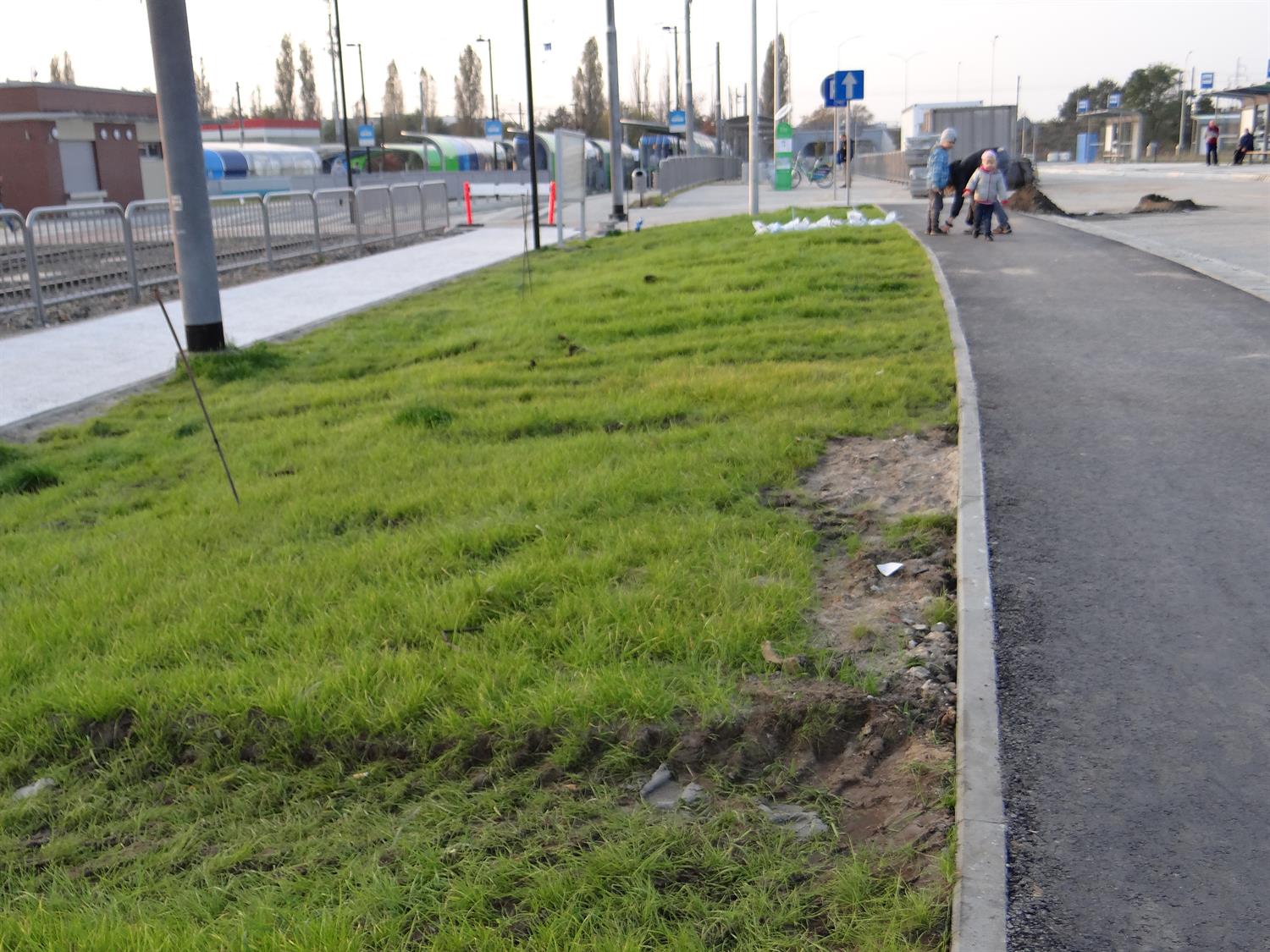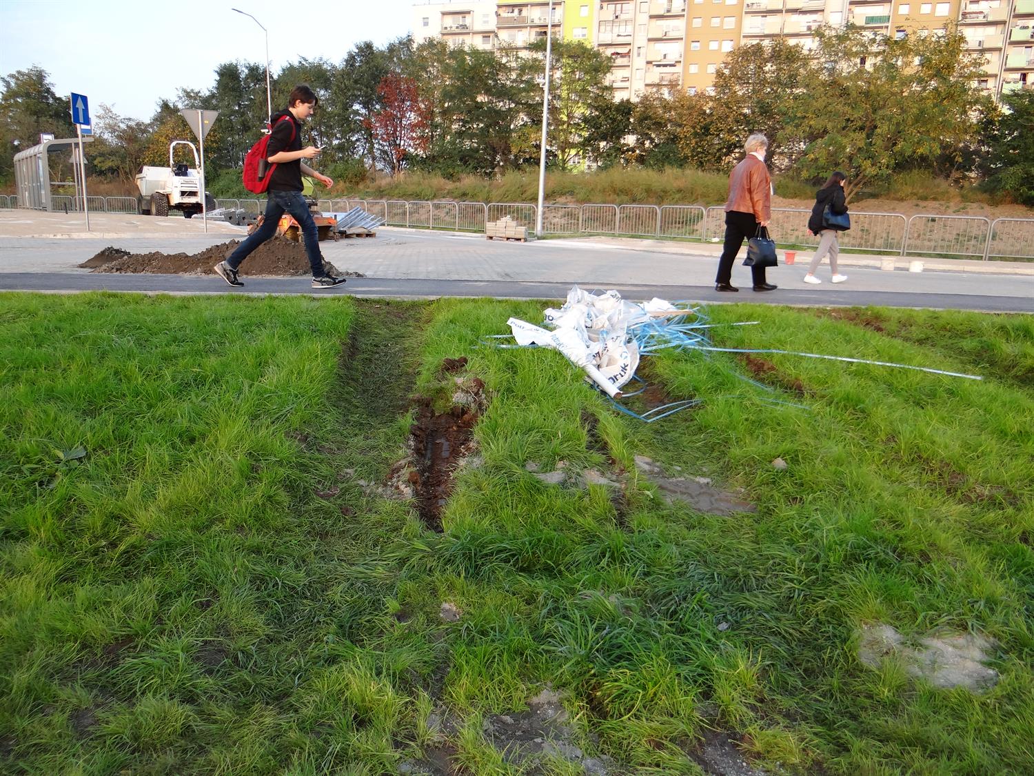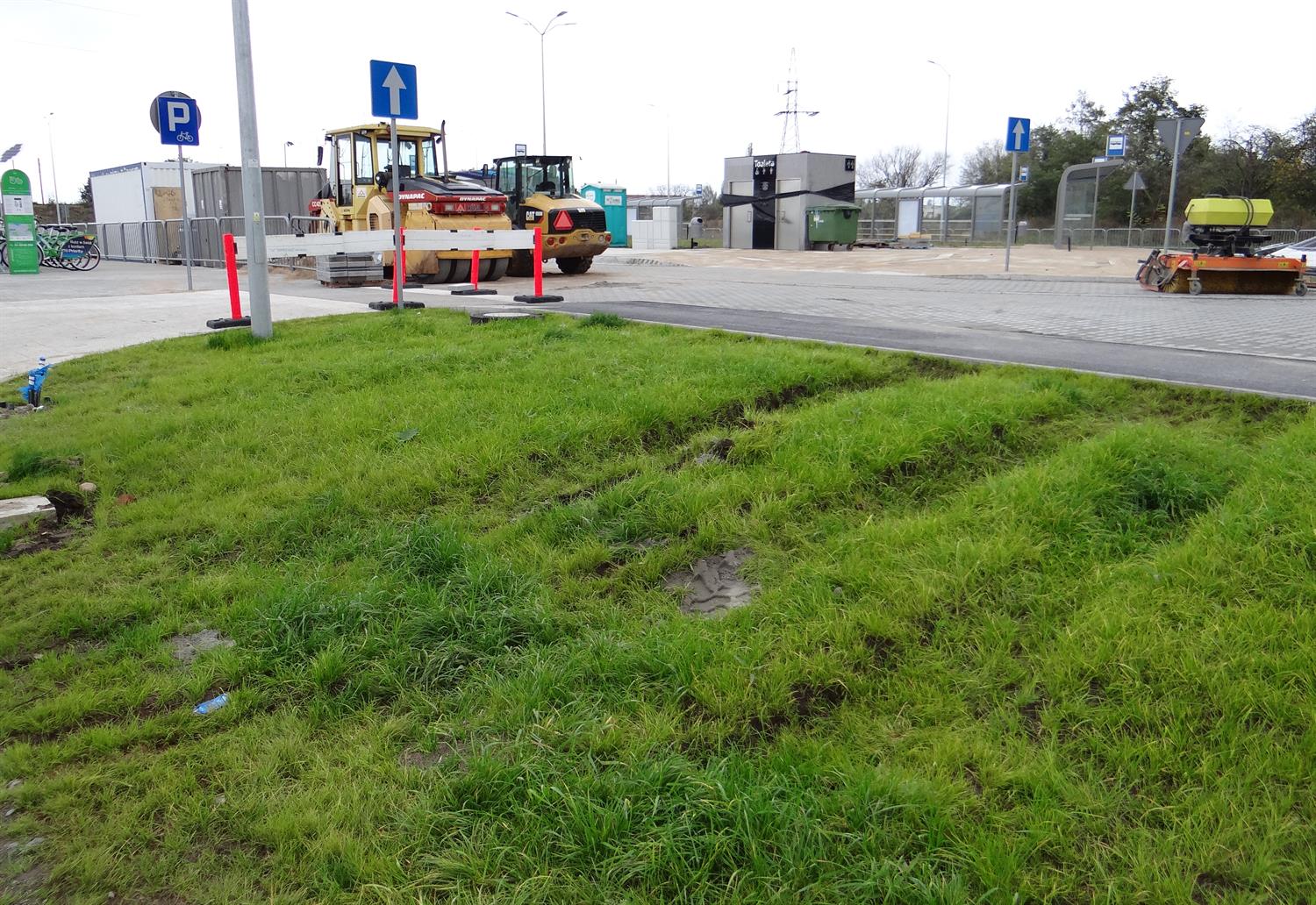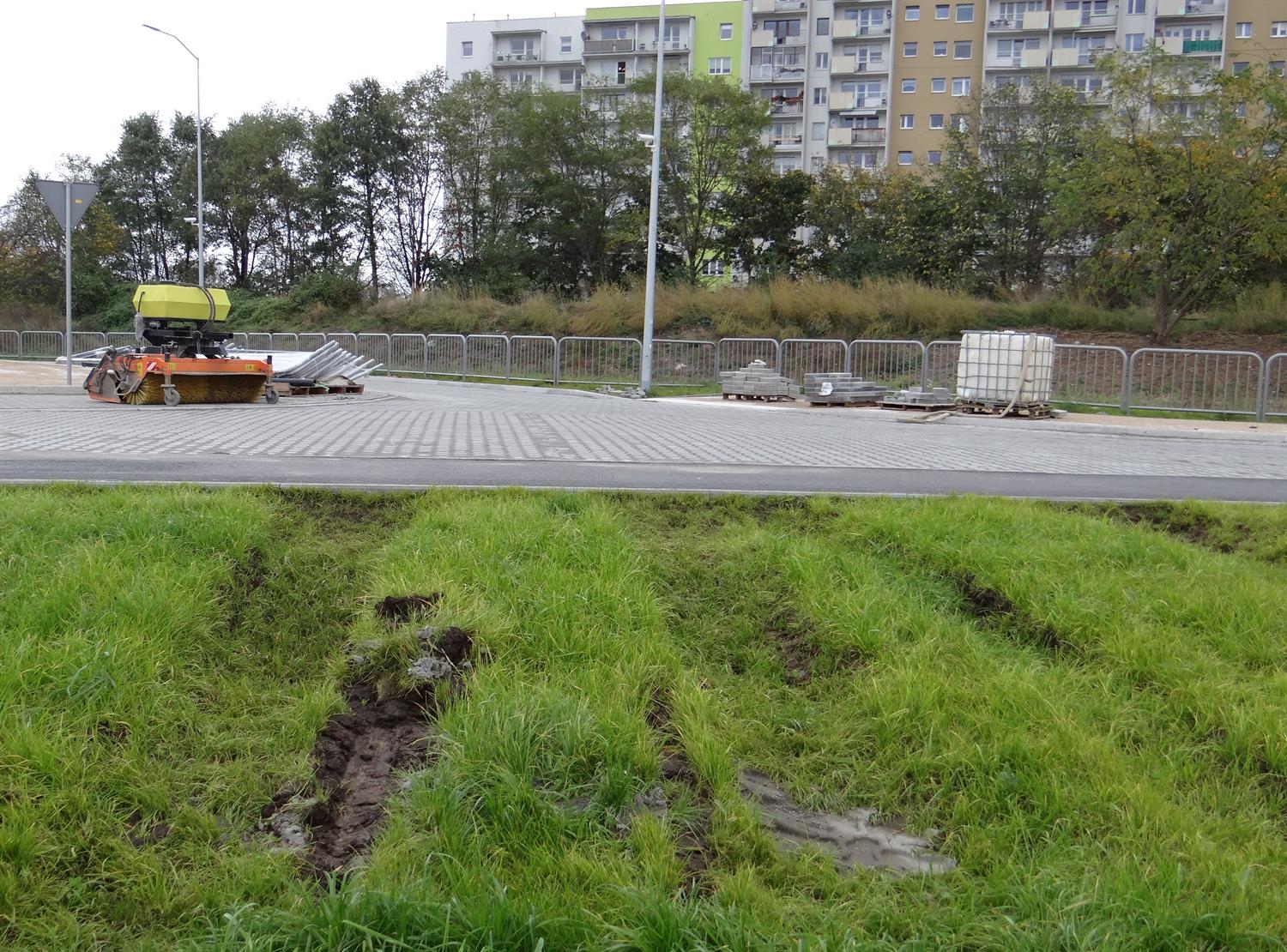 Pętla Turkusowa w Szczecinie. Nowy pas trawnika, urządzony latem, ale już zdewastowany. Najpierw wysiali trawę, ta wyrosła, a dopiero potem zabrali się za wylewanie nawierzchni asfaltowej na przyległym odcinku ścieżki rowerowej. Demolując przy okazji ciężkim sprzętem drogowym to, co już było gotowe. Rozjechali cały zieleniec. Tak wyglądają tam roboty drogowe w wykonaniu ekip robotników zatrudnianych przez spółkę Musing. Nic dziwnego, że w takich okolicznościach przyrody i realiach placu budowy ta komunalna inwestycja komunikacyjna zalicza kolejny i to długi poślizg. ©℗