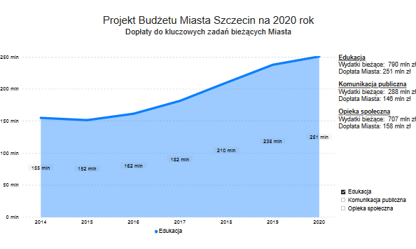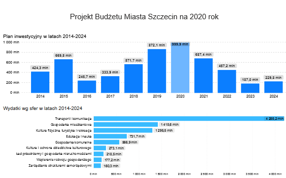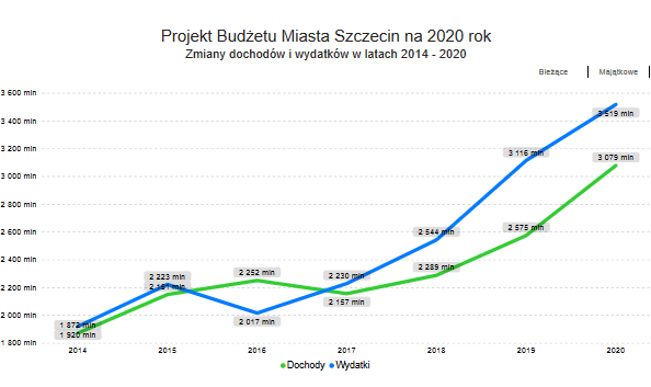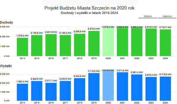 Dochody miasta w 2020 roku zaplanowano na poziomie 3 miliardów złotych. To jest o ponad 500 mln złotych więcej w porównaniu do planowanych wpływów w tym roku. Wzrost ma być efektem planowanych wyższych dotacji unijnych oraz dotacji z budżetu państwa na realizację programu "500 Plus". Głównym źródłem dochodów będzie podatek PIT - od osób fizycznych oraz CIT - od osób prawnych. Według miasta wprowadzone przez rząd zmiany w systemie podatkowym oraz te planowane na przyszły rok spowodują spadek potencjalnych wpływów do budżetu Szczecina o ponad 90 mln złotych. W budżecie na 2020 rok wydatki bieżące zaplanowano w wysokości 2,5 miliarda złotych - wyższe o prawie 261 mln zł w porównaniu do planowanego w 2019 roku. Główne kierunki wydatków nie ulegają zmianie: edukacja i nauka - 800 mln zł, (o 58 mln więcej niż w tym roku, dofinansowanie środkami własnymi miasta ponad kwotę subwencji i dotacji wzrośnie do 251 mln zł), pomoc społeczna i ochrona zdrowia, transport i komunikacja. Deficyt budżetowy planowany jest w wysokości 439 mln złotych.