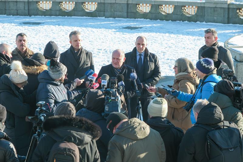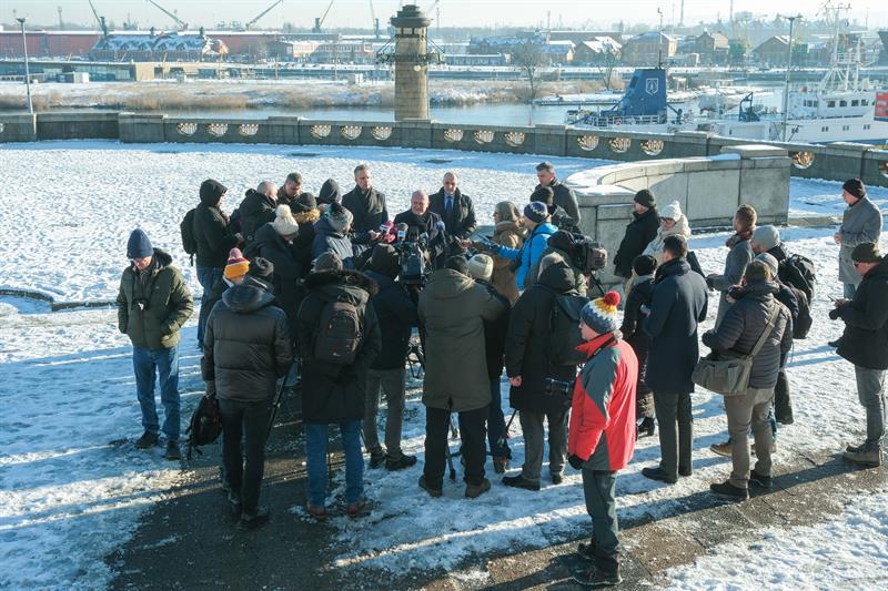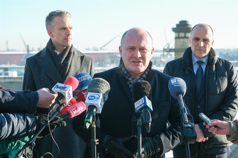 Briefing prasowy prezydenta Szczecina Piotra Krzystka, wojewody Adama Rudawskiego oraz wiceministra Arkadiusza Marchewki przykuł uwagę wielu dziennikarzy. Fot. Fot. Dariusz Gorajski