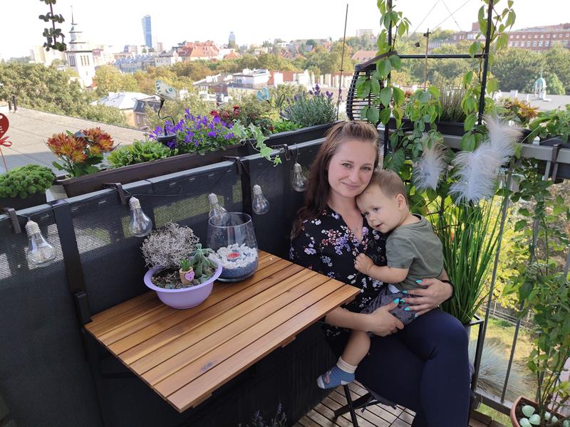 Czasem słyszy od Łukasza: „Gdzie ty to postawisz?!". Ale dokłada kolejne warstwy kolorów kwiatami, a też dodaje odcienie zieleni cyprysami, skalniakami i sukulentami, aby balkon cieszył oko przez cały rok. Teraz letnią aranżację zaczyna wypierać jesienna. Pojawiły się pierwsze chryzantemy i wrzosy. Choć synowie p. Patrycji pewnie by woleli, żeby balkonem znów zawładnął ogrodowy basen - ich ulubiona letnia zabawka. ©℗