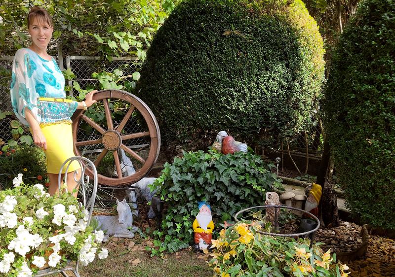 Na wejściu gości witają wybujałe czerwone begonie, hosty i równie efektowne canny oraz róże. Za nimi barwny korytarz tworzą okazałe sezonowe kwiaty w wielu odmianach – m.in. petunie, pelargonie, surfinie i bratki – rozmieszczone w donicach i na stojakach. Dopiero za nimi – starannie przystrzyżonym żywopłotem śnieguliczek – otwiera się ogrodowa przestrzeń, w jakiej nie trudno dostrzec mnóstwo dekoracyjnych detali. Pośród hibiskusów, rododendronów, jeżówek i rudbekii wyglądają nawet wróżki i elfy.
