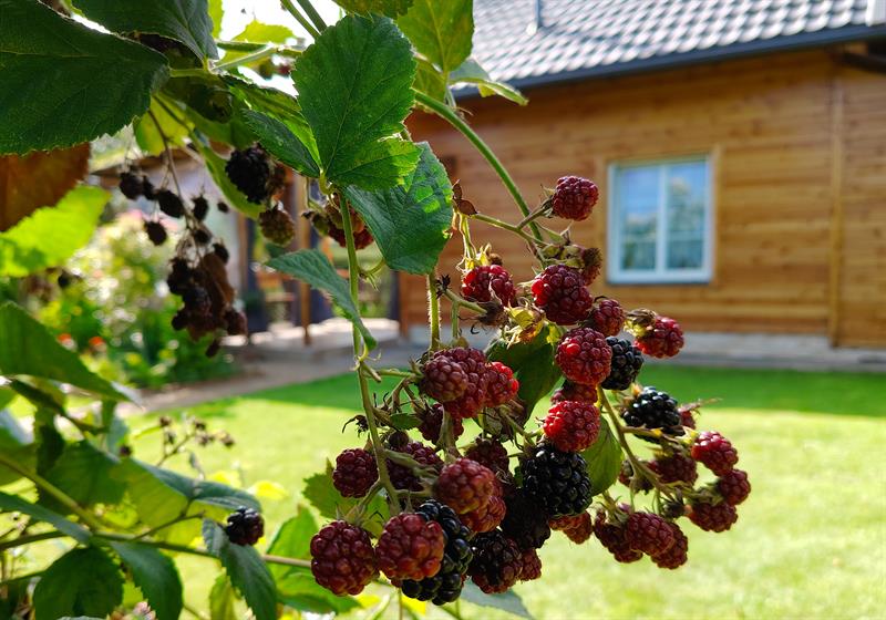 Na bieżąco zmienia się też paleta owoców i warzyw. Sporo - świeżych, zdrowych, naturalnych - urozmaica rodzinne biesiady. Maliny i jeżyny służą za dodatek do „nieba w gębie", czyli słynnych wypieków p. Janiny (bezy może skosztować każdy w Cukierni Sowa). Z pozostałych gospodyni robi „lato zamknięte w słoikach", czyli rozmaite soki, powidła, dżemy i weki.