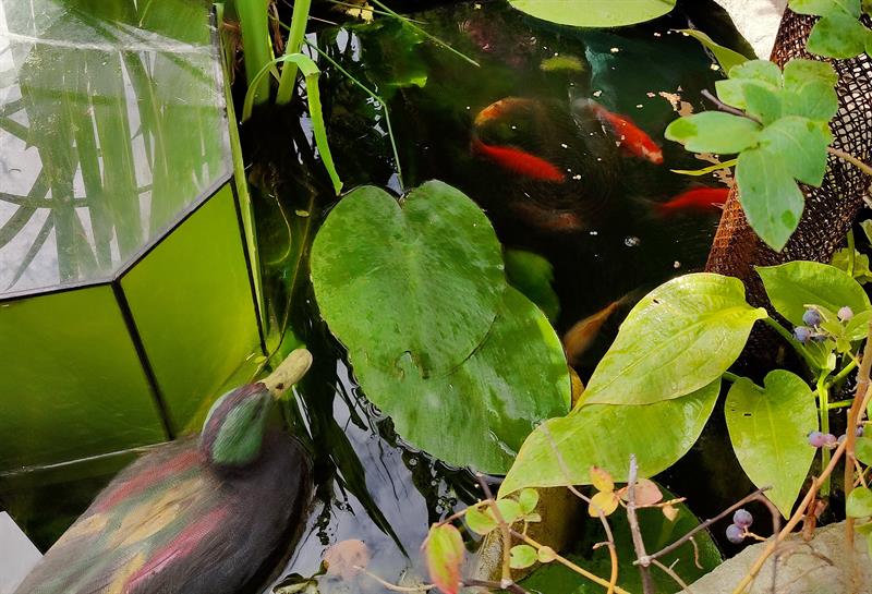 Dzięki p. Dariuszowi ogród ma rozbudowany system tzw. małej retencji, za sprawą którego jest zabezpieczony w wodę w okresach suszy, a też przygotowany do odbioru nadmiaru opadów, np. w czasie nawalnych deszczów. System zasila również fontannę oraz oczko wodne z karasiami, karpiami koi oraz żabą Beatą. Pan Dariusz zbudował aż dwa specjalne mechanizmy napowietrzania wody w zbiorniku, a też wymyślił sposób na automatyczne odprowadzanie jej nadmiaru dla zasilania sąsiednich kwietników.