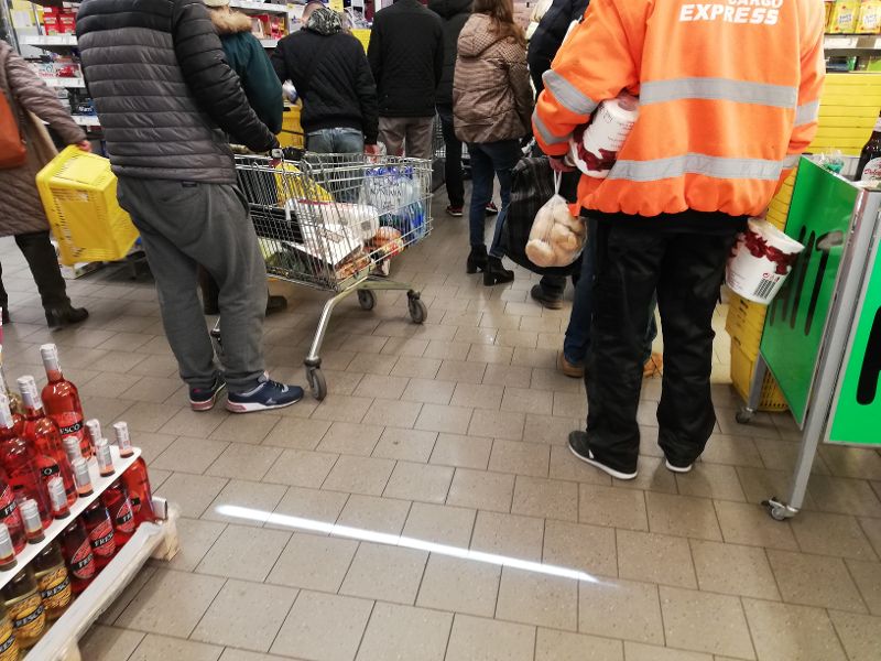 W dyskontach duży ruch i kolejki. Część klientów ustawia się w bezpiecznej odległości od innych. W Biedronce podawane są uspokajające komunikaty, że dostawy są zapewniane na bieżąco.