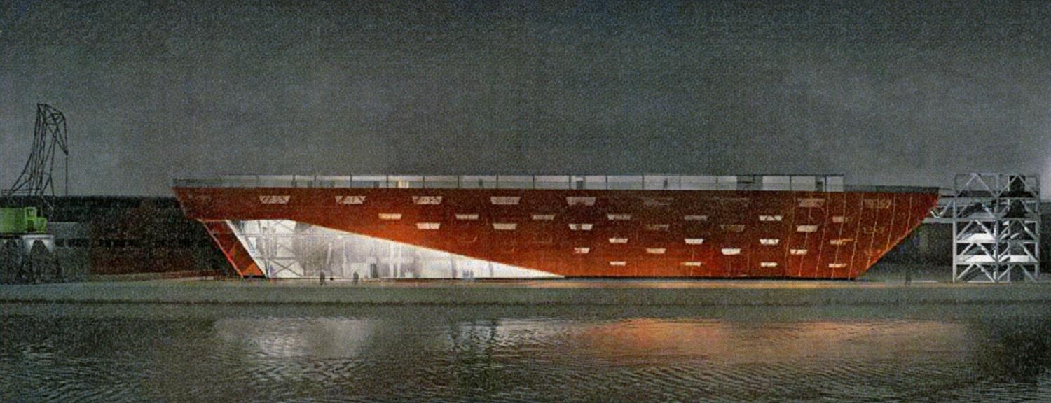 2. Obiekt bardziej by przypominał statek, gdyby miał nadbudówkę.dałoby to także dodatkową powierzchnię ekspozycyjna. W proponowanym kształcie bardziej kojarzy się z Arką Noego albo lotniskowcem.
