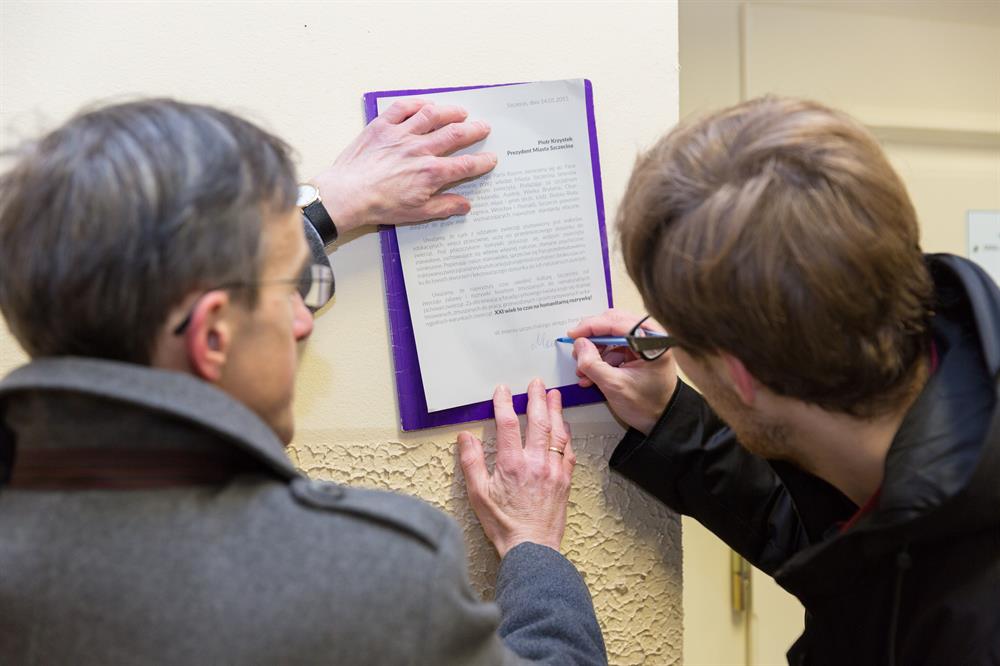 Na zdjęciu: „XXI wiek to czas na humanitarną rozrywkę!" - przekonują przedstawiciele Partii RAZEM i przekazują w magistracie apel do prezydenta Piotra Krzystka o zamknięcie bram Szczecina dla cyrków ze zwierzętami.