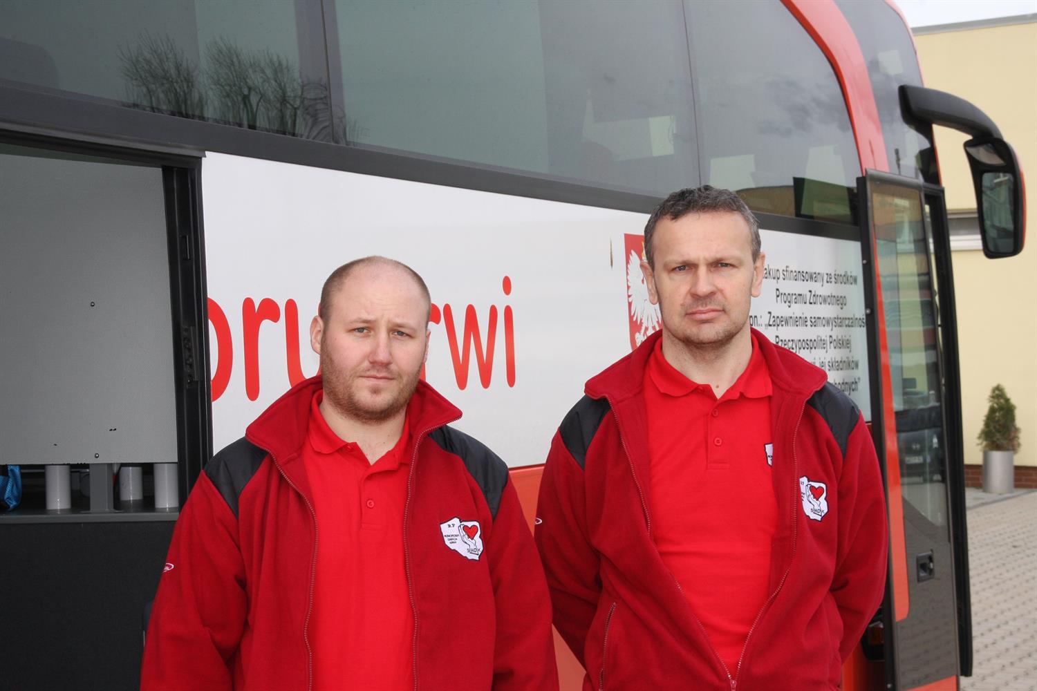 Na zdjęciu od prawej: Artur Sałagan i Paweł Fiałkowski, prezes i wiceprezes Stowarzyszenia Honorowych Dawców Krwi RP w Policach przed mobilną stacją krwiodawstwa.