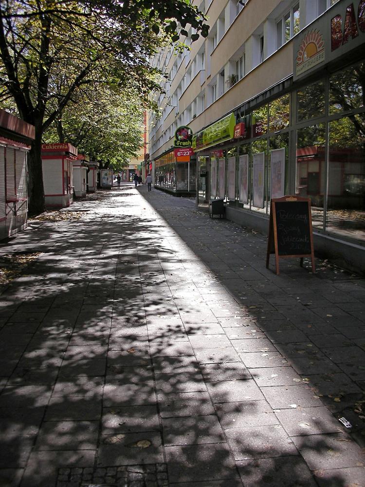 Ciąg dalszy tego ciągu pieszego w al. Wyzwolenia, miedzy placami Rodła i Żołnierza Polskiego, niestety nie jest lepszy: płyty granitowe „ułożone” każda na innym poziomie, wyrwane kostki brukowe, ciasnota, ponieważ większą część szerokości chodnika zajmują parkujące samochody.