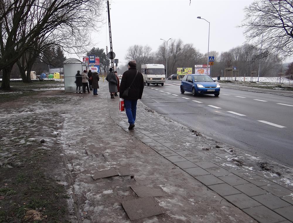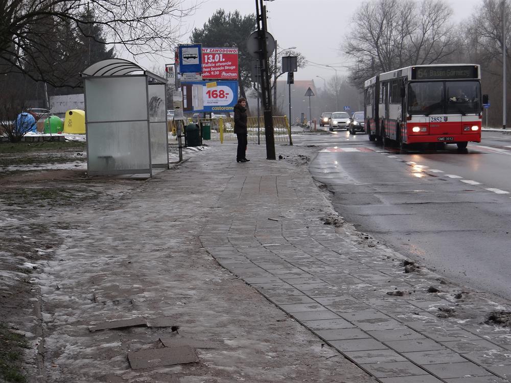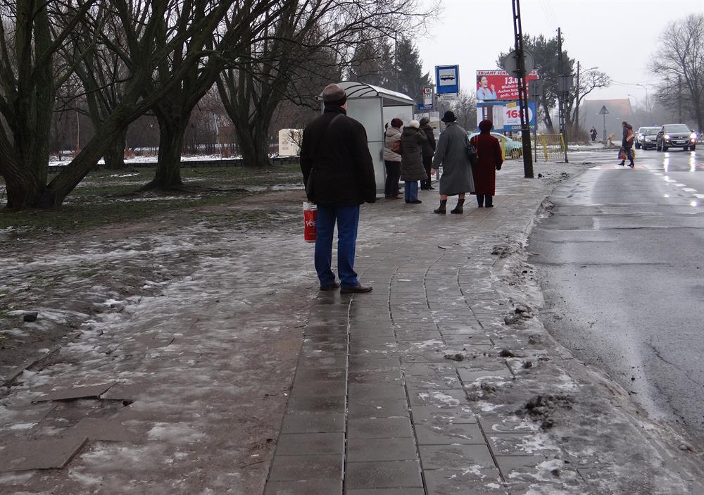 Ludzie dalej potykają się, bo ktoś w ZDiTM zlecił doraźną przekładkę na tym odcinku, a dokładnie tylko na połowie jego szerokości od trzech do pięciu chodnikowych płytek od krawężnika przy jezdni. Pozostały pas z właściwym dojściem pod samą wiatę (jak na dołączony obrazku) od strony trawnika jest nietknięty, nadal koślawy, z połamanymi i zapadniętymi płytami.