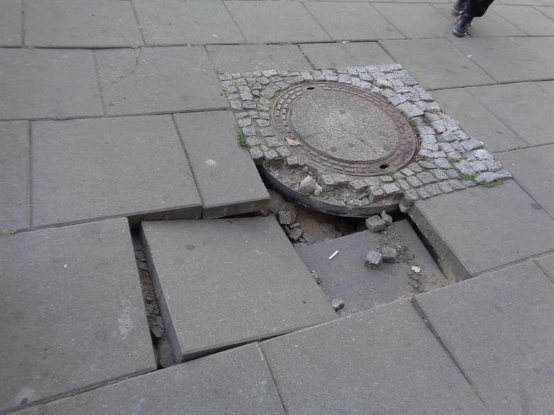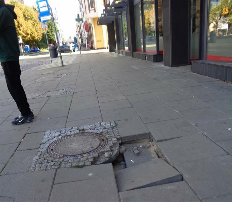 Dużo mniejsze, choć równie niepokojące, dwa kolejne zapadliska pojawiły się także w dalszej części chodnika: przy tej samej ul. Tkackiej, tyle że za skrzyżowaniem z ul. Grodzką. I jak to przy przystanku autobusowym, a wcześniej łatane przy skrzyżowaniu z ul. Wyszyńskiego, każe się zastanowić nad tym, co kryje ziemia w tej części Starego Miasta. ©℗