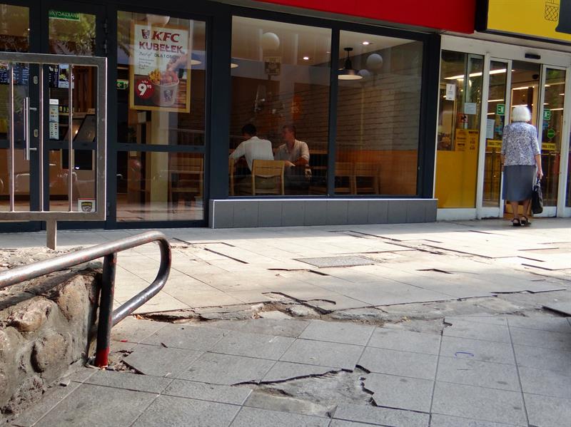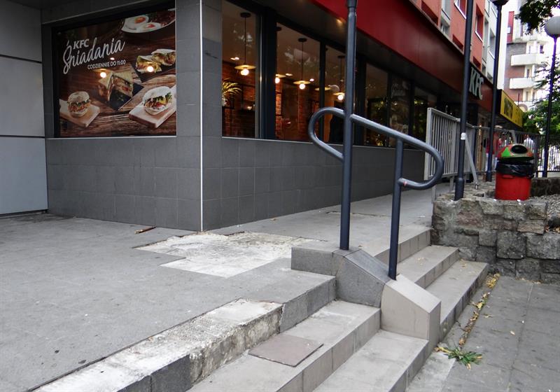 Problem w tym, że nie jest ona – jak powinna – wykonana z płytek chodnikowych czy też – jak wyremontowana nawierzchnia al. Niepodległości – z płyt granitowych. Lata temu ułożono na niej porcelanowe płytki. Można się domyślać, że chodziło o wyeksponowanie mozaiki znaku graficznego KFC. Czy w zamian za „chodnikową reklamę” lokal miał dbać o tę nawierzchnię? Teraz tego nie sposób ustalić. Dość, że teren jest własnością miasta i to bezpośrednio Zarząd Dróg i Transportu Miejskiego za ten ciąg pieszy odpowiada. Zarówno za stan nawierzchni, jak i bezpieczeństwo przechodniów.