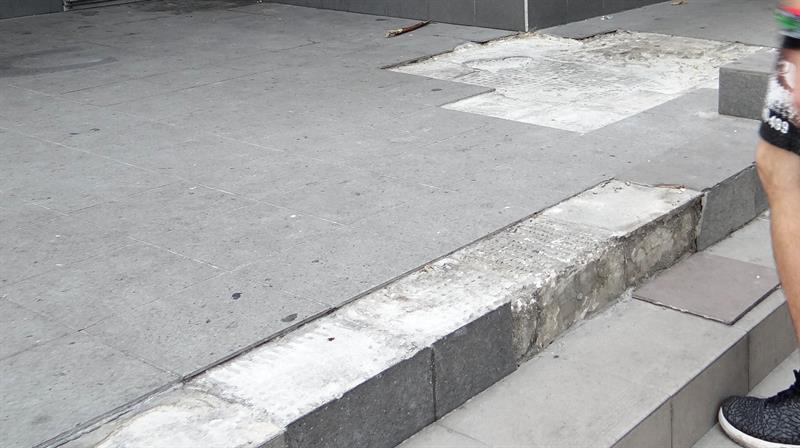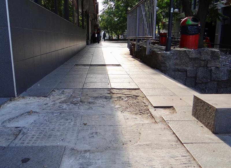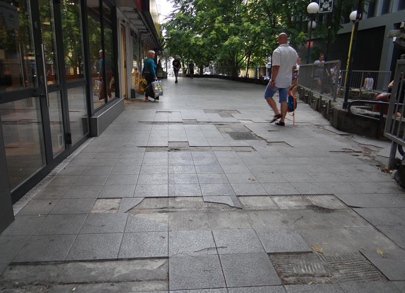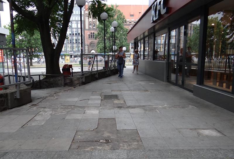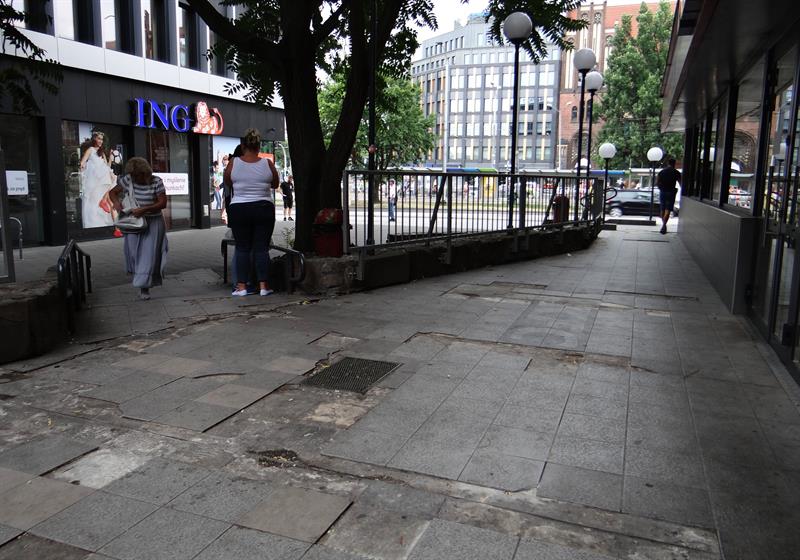 Kiepska to odpowiedzialność, skoro z roku na rok to miejsce – położone w reprezentacyjnym rejonie miasta – staje się coraz obskurniejsze. Płytki kolejno odpadają, odsłaniając dziury betonowej zaprawy. Łatwo się o nie potknąć, przewrócić, co już nieraz kończyło się fatalnie, szczególnie dla osób starszych i dzieci. Jeszcze gorzej to miejsce wygląda po deszczu, gdy zagłębienia dziurawej nawierzchni skrywa stojąca woda. Rozlewiska zmieniają się w istne pułapki na pieszych.