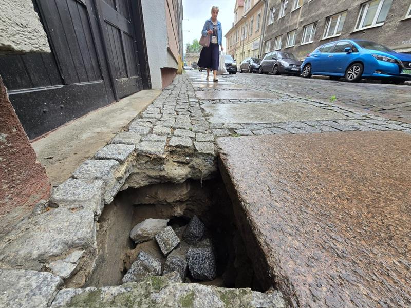 Padające ulewne deszcze spowodowały wymycie piasku spod chodnika na ulicy Mariackiej w Szczecinie. W efekcie tuż przy wejściu do bramy nr 3 powstała sporych rozmiarów wyrwa. Niestety, dziura nie jest w żaden sposób zabezpieczona. Trzeba więc jak najszybciej to naprawić.