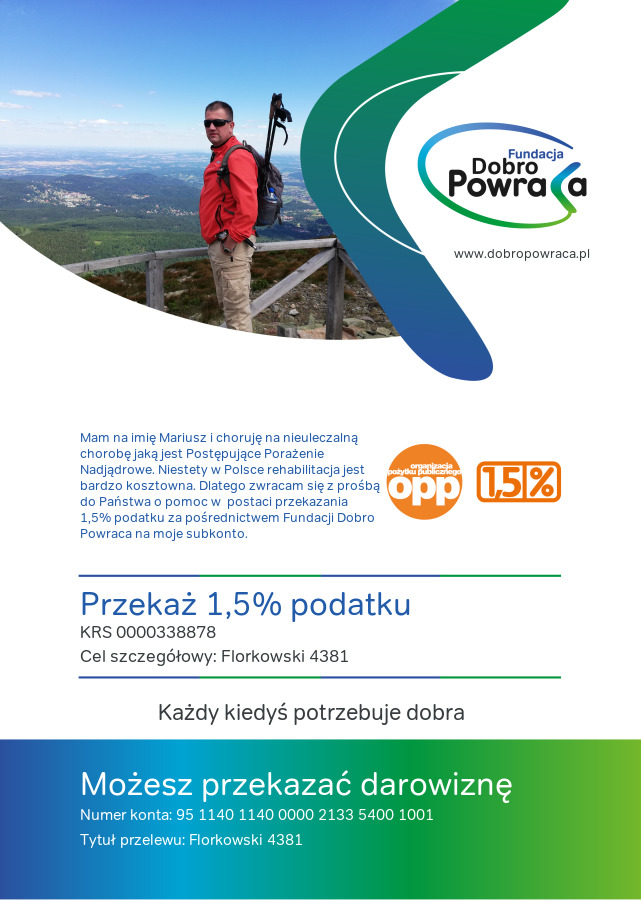 – Leczenie objawów PSP może przybierać różne formy. Mariusz czy inni pacjenci często używają urządzeń ortopedycznych do chodzenia, aby przeciwdziałać tendencjom do upadków do tyłu. Niestety Mariusz coraz częściej przewraca się i łamie sobie żebra, czy rozbija głowę. Tak było już wielokrotnie. On potrzebuje większego wsparcia. Każda złotówka jest tu ważna. Mamy otwarte konto na portalu zbiórkowym Fundacji DOBRO POWRACA, gdzie jest numer konta oraz KRS 0000338878. Z dopiskiem: cel szczególny Florkowski 4381. Dziękujemy za bezinteresowną pomoc, otwarte serce i życzliwość, którą od Państwa otrzymaliśmy. Jesteśmy niezmiernie wdzięczni za każdy dobry gest… – mówi pani Agnieszka. ©℗