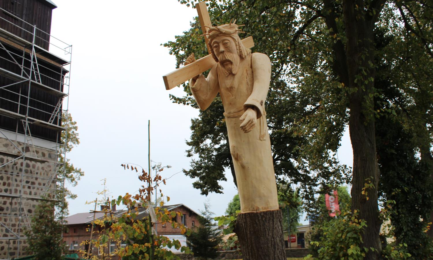 Taki nietypowy widok, jak na naszym zdjęciu, można ujrzeć jadąc drogą krajową nr 10 od przejścia granicznego w Lubieszynie w kierunku Szczecina. Chrystus uginający się pod krzyżem znajduje się na terenie kościoła pw. Matki Boskiej Bolesnej w Mierzynie.