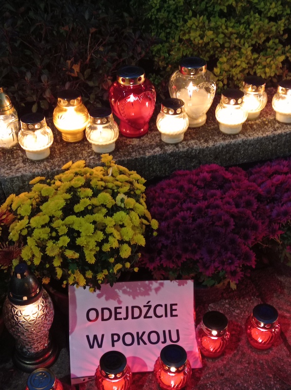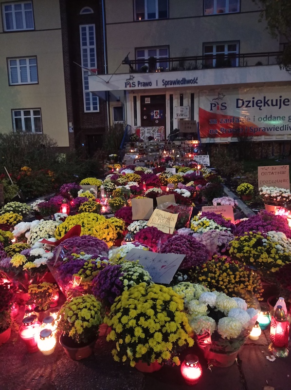 Dziesiątki chryzantem i zniczy, które miały trafić na cmentarze szczecinianie złożyli pod siedzibą Prawa i Sprawiedliwości przy ul. Mickiewicza w Szczecinie.