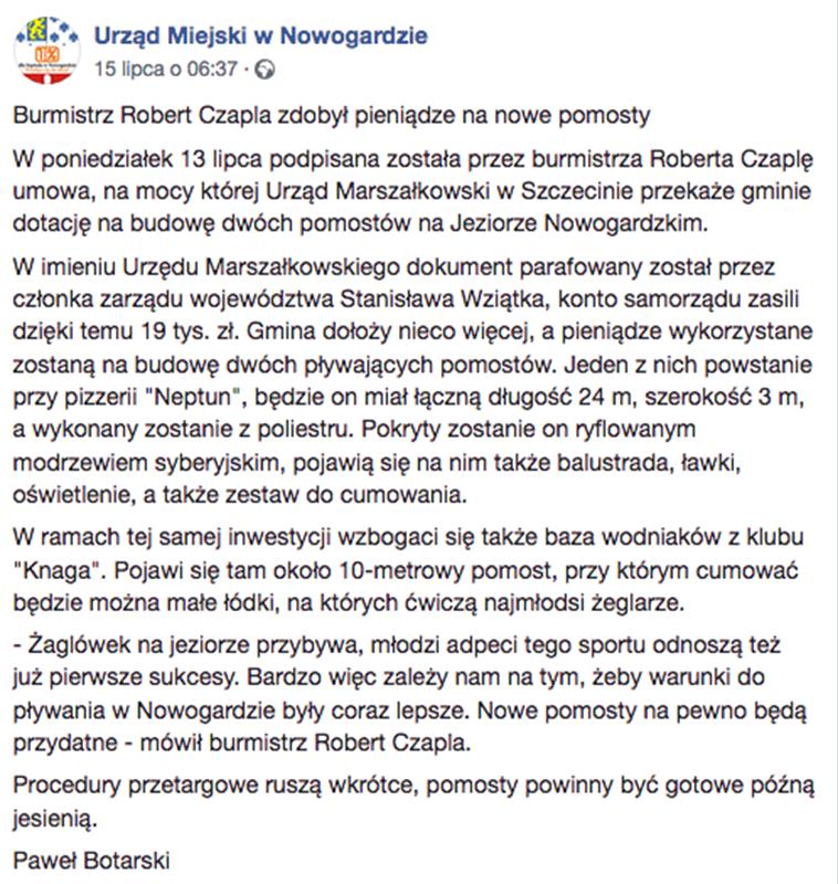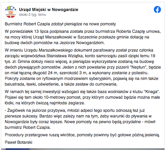 Paweł Botarski, redaktor strony nowogardzkiego urzędu, na profilu gminy opisuje wydarzenia gminne, nagłaśnia sukcesy w pozyskiwaniu funduszy na rozwój gminy Nowogard, chwali burmistrza Roberta Czaplę, że przekazuje szpitalowi w Nowogardzie symboliczny czek na 1 mln zł…