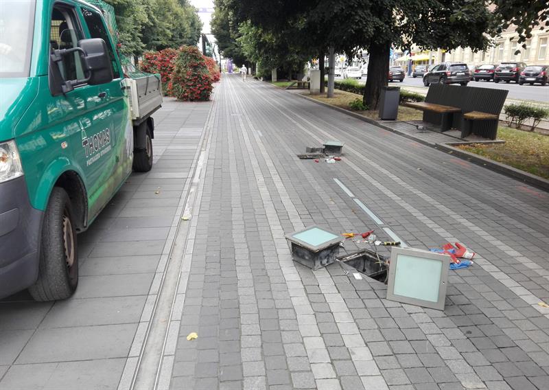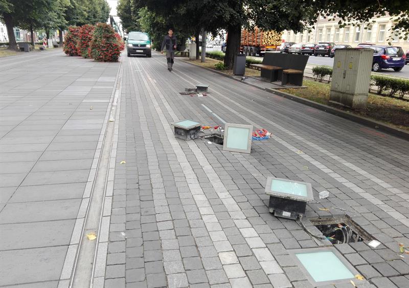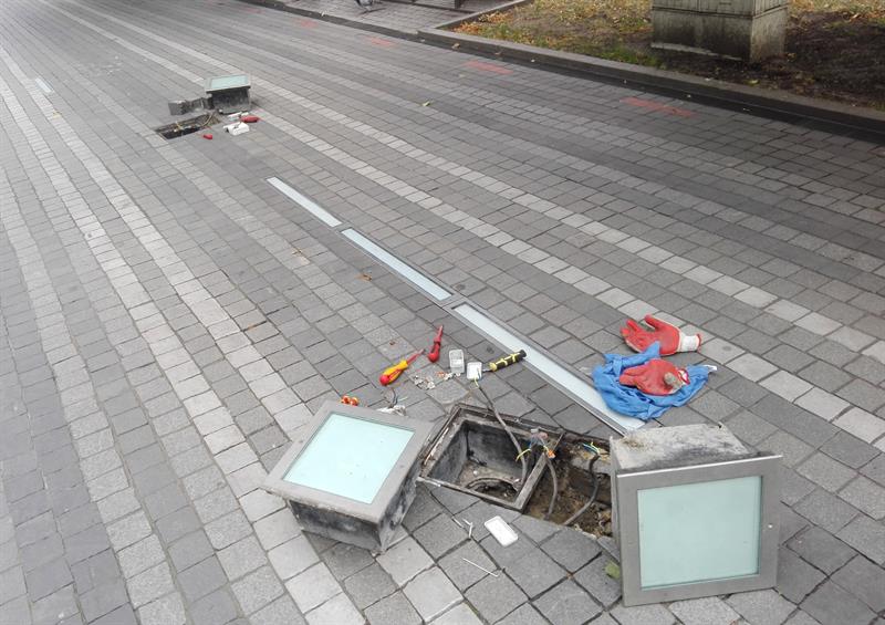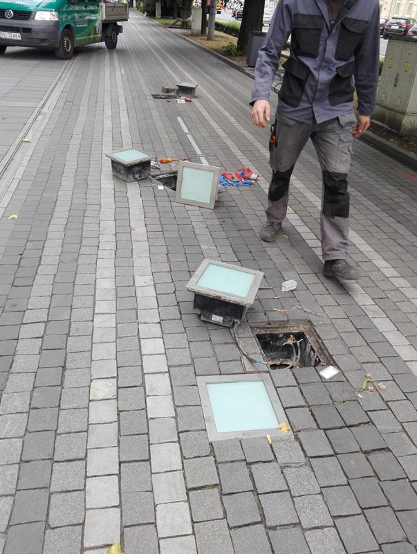 Jeszcze przed tygodniem w dawnej alei kwiatowej były wykopy. Nieco wcześniej - wymiana kilkudziesięciu płytek nawierzchni. Sporo z połamanych przetrwała ten swoisty remont cząstkowy. Co widać szczególnie od strony słonecznego zegara. Ale teraz… nadszedł czas na prace elektryczne. Nie przez przypadek aleja jest też zwana skrzynkową (przypomnijmy: od ilości szpecących ją skrzynek elektrycznych). Oświetlenie nawierzchni - w tym świetlne kubiki - wymaga bowiem odpowiedniego zabezpieczenia. Właśnie wymieniono przy „szklanej pułapce" jedną zniszczoną oprawę wpustowej lampy, a następne cztery - jak na zdjęciu - czekają w kolejce na konserwację.