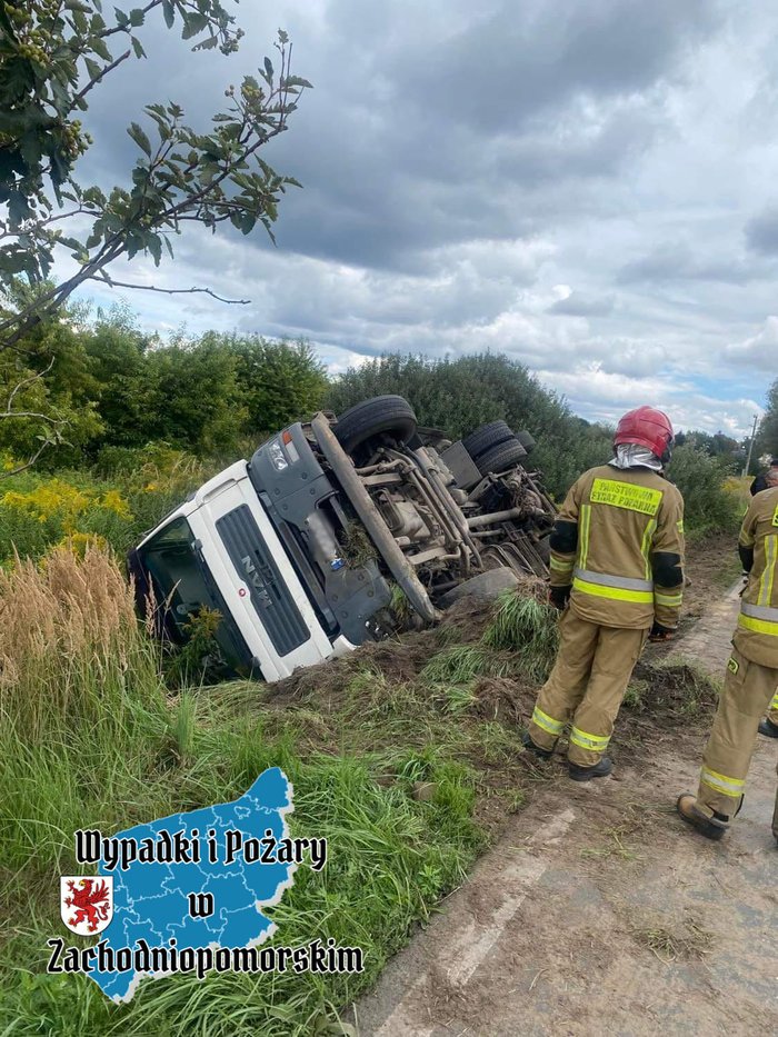 Do niebezpiecznego zdarzenia doszło we wtorek po południu przy ul. Tczewskiej w Szczecinie (Wielgowo). Ciężarówka z cysterną zjechała tam z jezdni i przewróciła się do rowu.