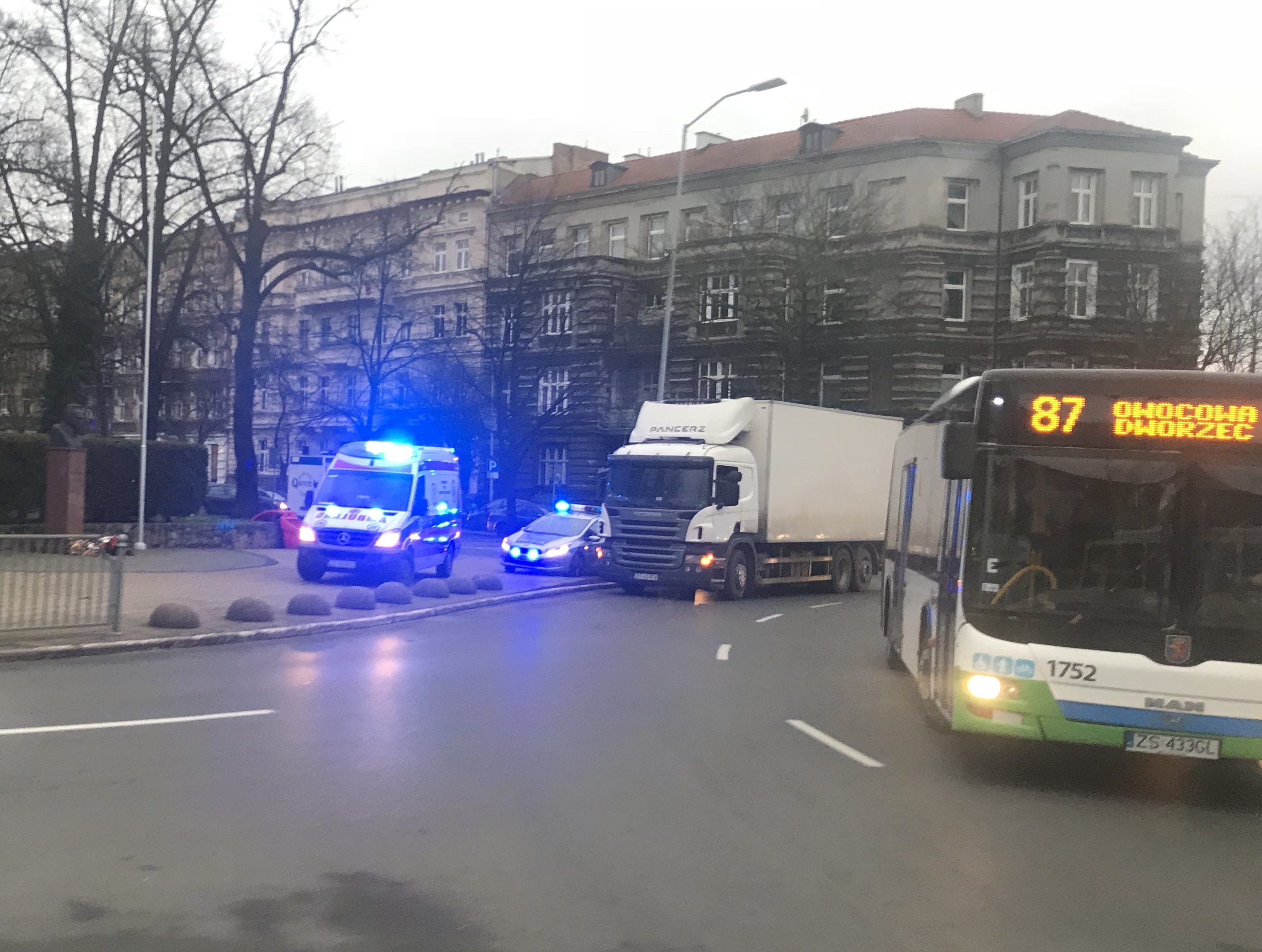 Do zderzenia TiR-a i policyjnego radiowozu doszło w piątek rano na placu Szarych Szeregów w Szczecinie.