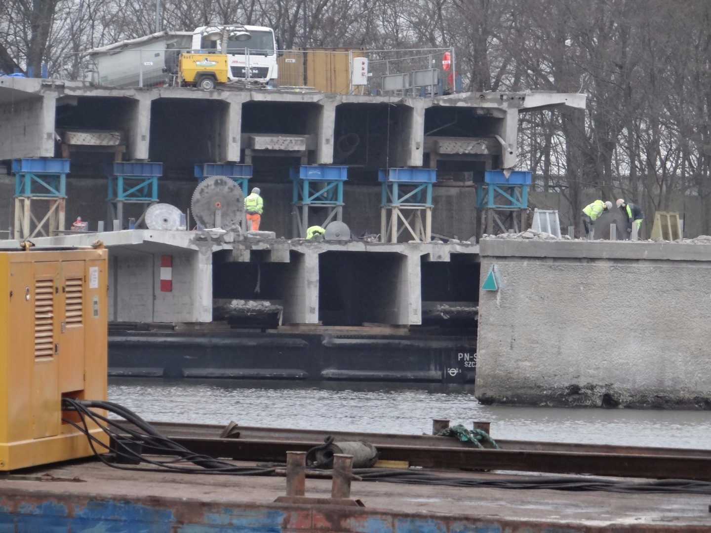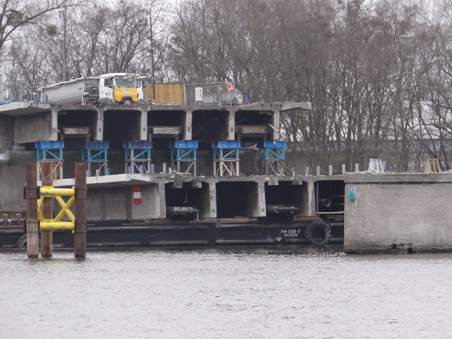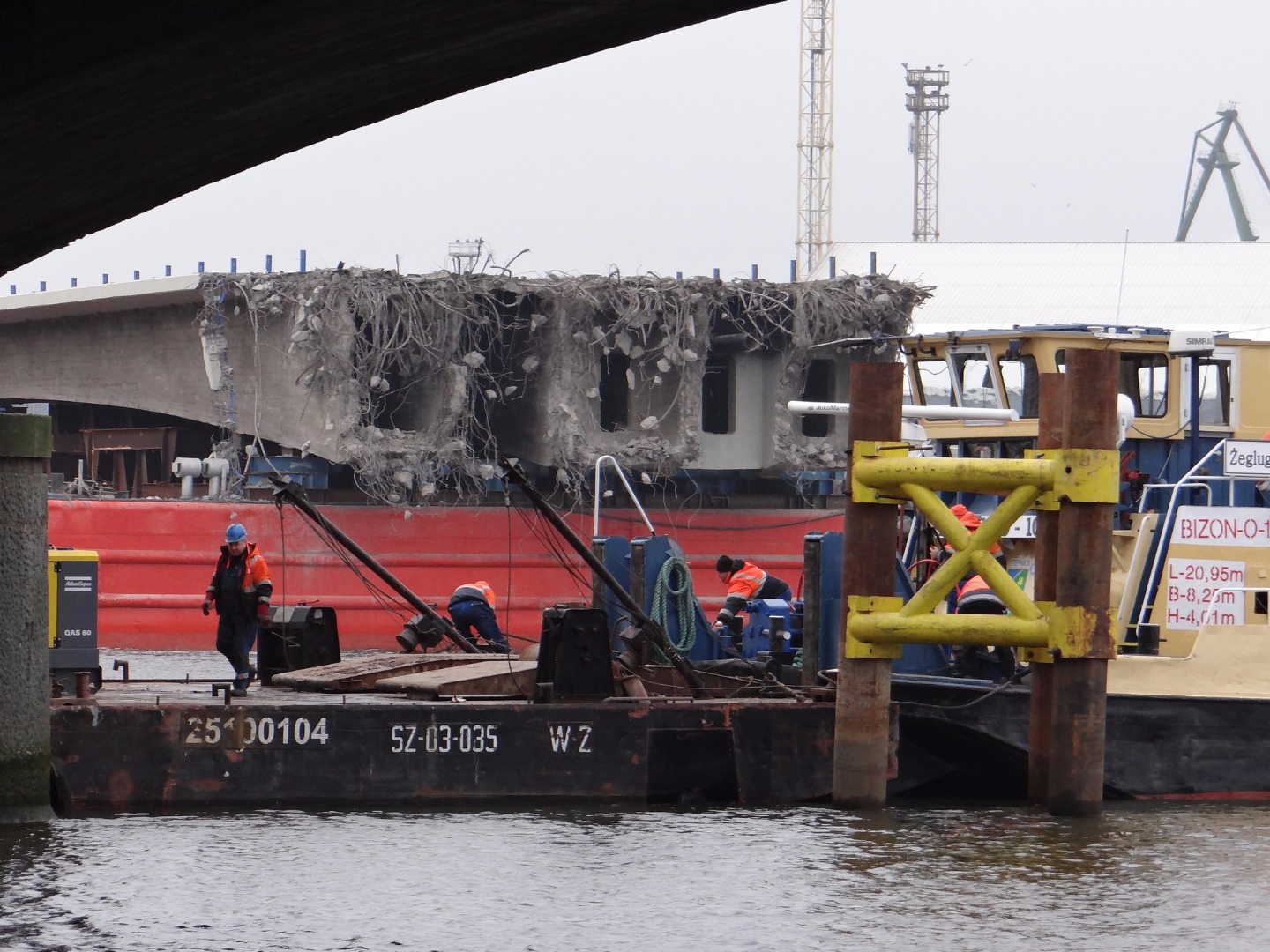Pozostałe części są sukcesywnie cięte podłużnie i poprzecznie i także opuszczane z pomocą dźwigów na platformach pływających. Sprzęt specjalistyczny wspomagają popularne szczecińskie Bizony. Po realizacji tej części umowy wykonawca przystąpi do prac naprawczych i konserwacyjnych na filarach i odsłoniętych przyczółkach. Przekazanie projektu wykonawczego i budowlanego obiektu powinno nastąpić do końca stycznia 2017 roku.