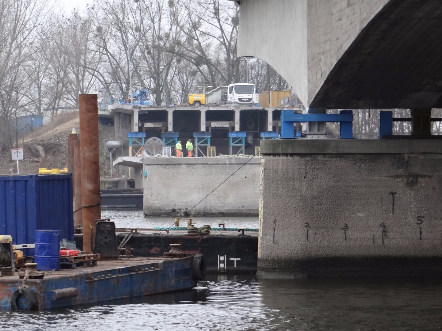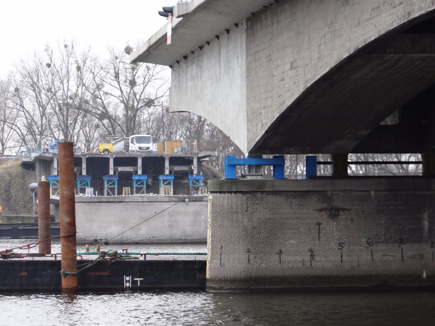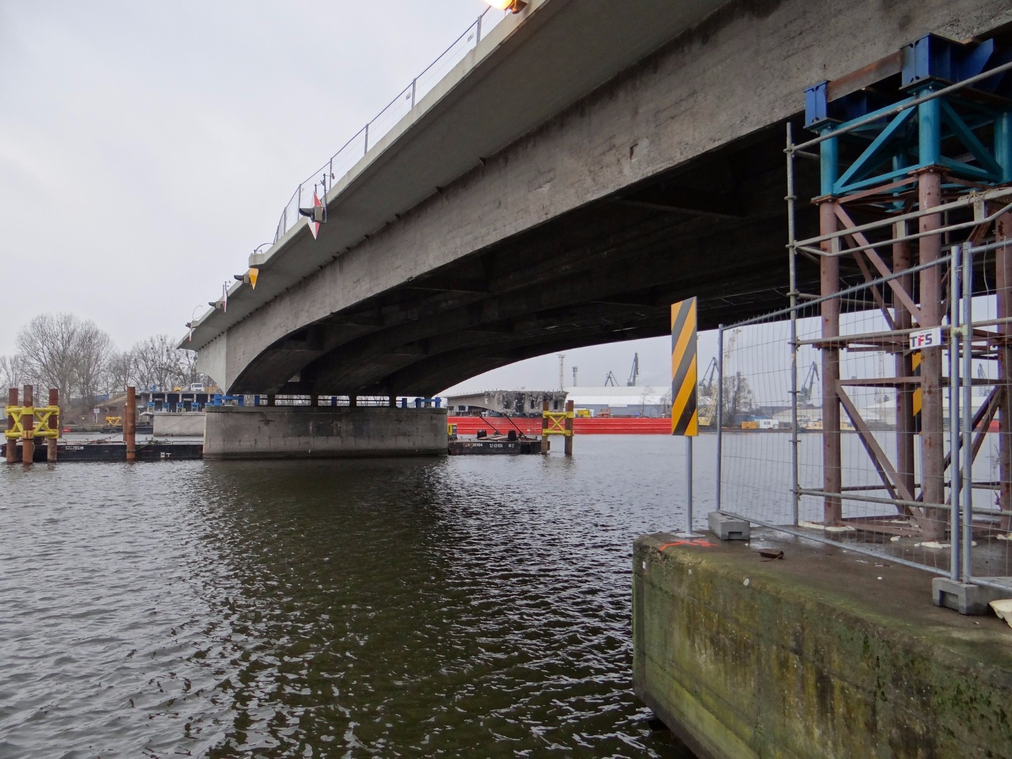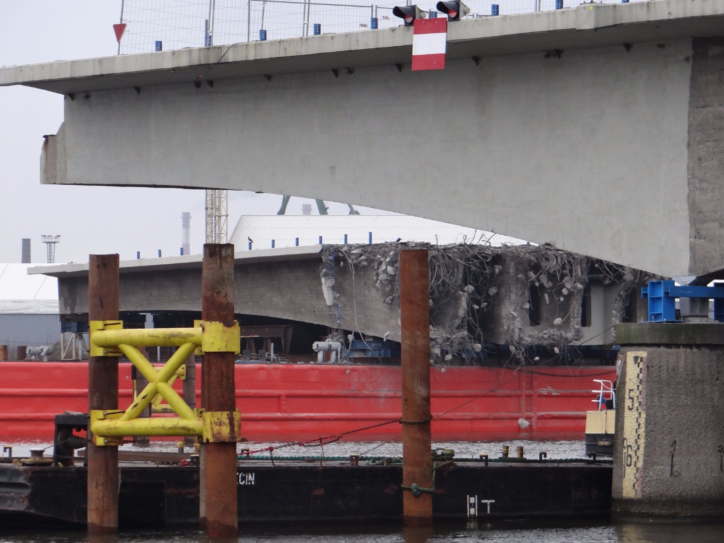 Pozostałe części są sukcesywnie cięte podłużnie i poprzecznie i także opuszczane z pomocą dźwigów na platformach pływających. Sprzęt specjalistyczny wspomagają popularne szczecińskie Bizony. Po realizacji tej części umowy wykonawca przystąpi do prac naprawczych i konserwacyjnych na filarach i odsłoniętych przyczółkach. Przekazanie projektu wykonawczego i budowlanego obiektu powinno nastąpić do końca stycznia 2017 roku.