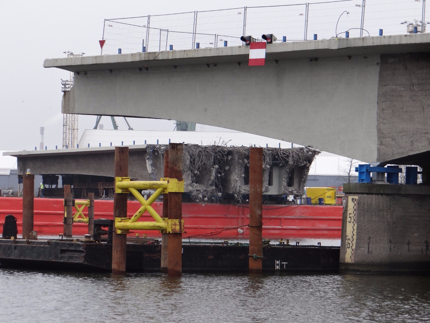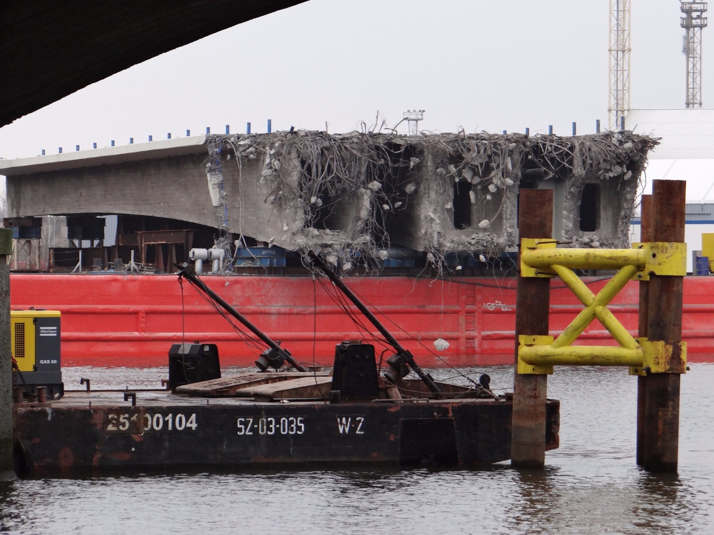 W pierwszej kolejności, podparte zostało przęsło, które uległo awarii. Następnie podniesione i wysunięte zostało przęsło środkowe. Ten etap był najbardziej skomplikowany i trwał w sumie dwa dni. Podczas robót pomocne są dwie specjalne jednostki pływające: Carier 10 o wyporności 10 tys. ton, na którym ustawiono rusztowanie podpierające przęsło zachodnie, a druga jednostka Carier 4 o wyporności ok. 4 tys. ton posłużyła do tego, żeby rozpocząć rozbiórkę, która zaczęła się właśnie od demontażu wspomnianego przęsła tzw. zawieszonego, Gerberowskiego, czyli środkowego.